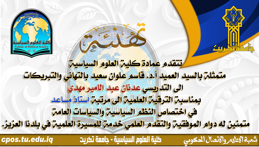 تتقدم عمادة كلية العلوم السياسية متمثلة بالسيد العميد أ.د. قاسم علوان سعيد بالتهاني والتبريكات الى التدريسي عدنان عبد الامير مهدي بمناسبة الترقية العلمية الى مرتبة استاذ مساعد في اختصاص النظم السياسية والسياسات العامة متمنين له دوام الموفقية والتقدم العلمي خدمة للمسيرة العلمية في بلدنا العزيز.