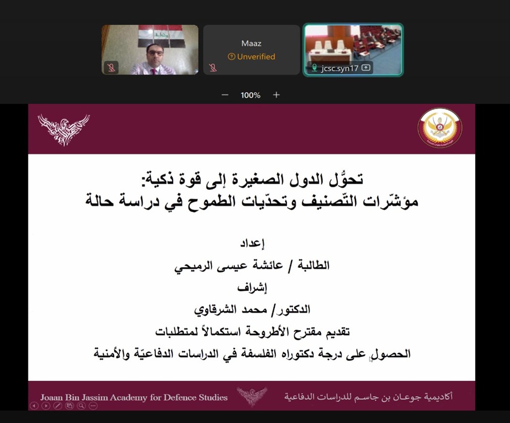 شارك الأستاذ المساعد الدكتور سيف نصرت توفيق في مناقشة مقترح دكتوراه PhD Proposal Defense في أكاديمية جوعان بن جاسم للدراسات الدفاعية والأمنية في قطر حول موضوع "تحوُّل الدول الصغيرة إلى قوة ذكية: مؤشرات التصنيف وتحديات الطموح دراسة حالة" للباحثة عائشة عيسى صقر الرميحي.