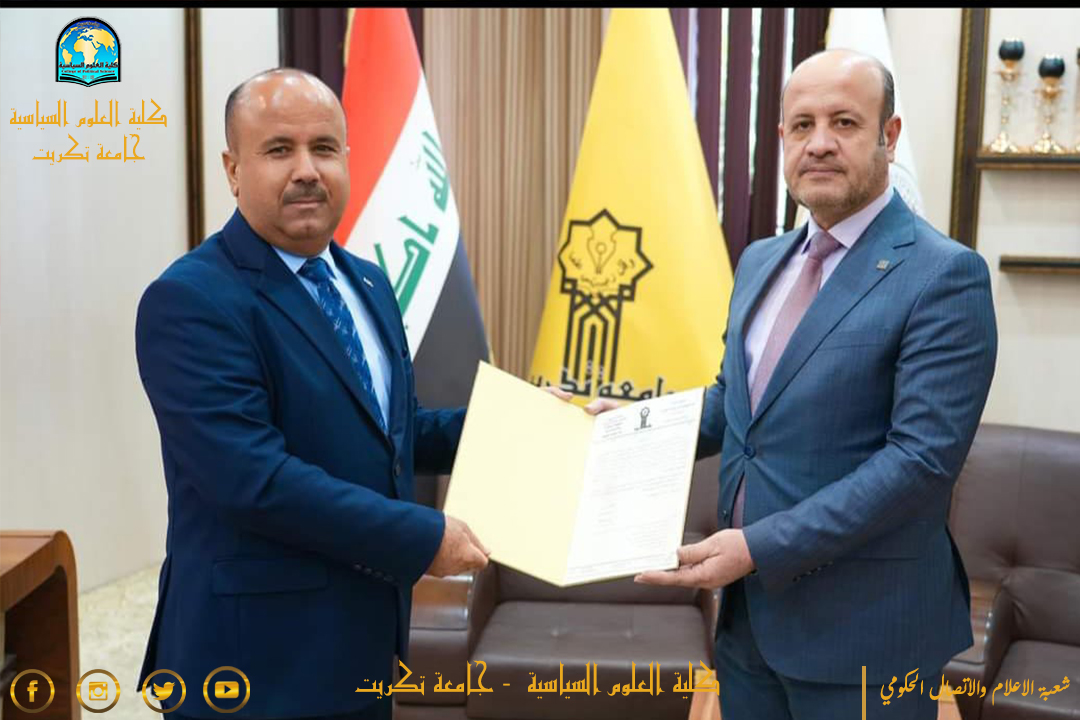يتقدم كادر كلية العلوم السياسية جامعة تكريت متمثلاً بالكادر التدريسي والوظيفي بأحر التهاني و التبريكات للاستاذ الدكتور قاسم علوان سعيد بمناسبة تثبيته عميداً لكلية العلوم السياسية بالأصالة متمنين له التوفيق والنجاح الدائم لخدمة المسيرة العلمية في كليتنا وجامعتنا وبلدنا العزيز.