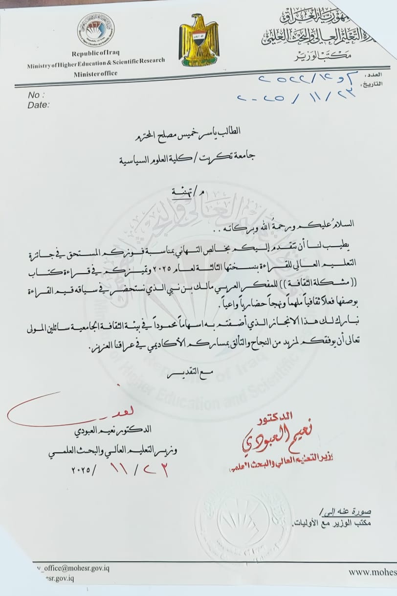كرم معالي وزير التعليم العالي الدكتور نعيم العبودي المحترم في وزارة التعليم العالي اليوم الخميس ٢٧ / ١١ / ٢٠٢٥ وبحضور السيد رئيس جامعة تكريت الاستاذ الدكتور وعد محمود رؤوف المحترم والسيد عميد الكلية الاستاذ الدكتور قاسم علوان سعيد الطالبان علاء الدين حمد عايد من كلية الطب والحاصل على المركز الثالث والطالب ياسر خميس مصلح من كلية العلوم السياسية والحاصل على المركز الثالث والعشرين من أصل أربعين مركزاً ضمن مسابقة القراءة في نسختها الثالثة، التي نظّمتها الوزارة ، وبمشاركة (27,049 ألف) متنافساً من طلبة البكالوريوس والدراسات العليا والطلبة الدوليين الدارسين داخل العراق.