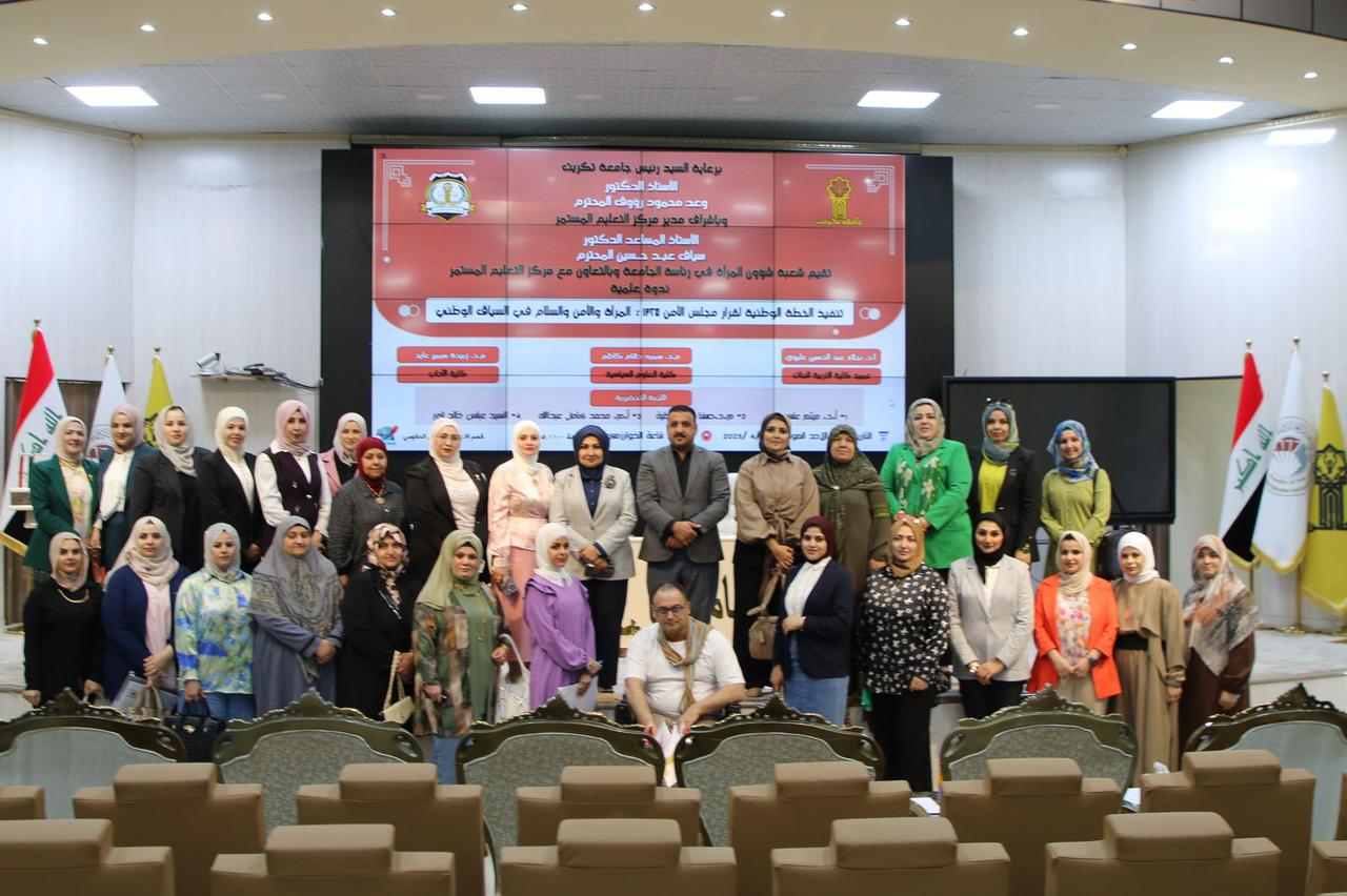برعاية الاستاذ الدكتور وعد محمود رؤوف رئيس جامعة تكريت، شاركت الدكتورة سميه دهام كاظم مسؤول وحدة شؤون المرأة بكليتنا في الندوة التي أقامتها شعبة شؤون المرأة في رئاسة الجامعة ومركز التعليم المستمر والموسومة "تنفيذ الخطة الوطنية لقرار مجلس الأمن ۱۳۲۵: المرأة والأمن والسلام في السياق الوطني" والتي حاضر فيها الاستاذ الدكتورة نجلاء عبد الحسين عليوي عميد كلية التربية للبنات والدكتورة زبيدة سمير عايد من كلية الاداب.