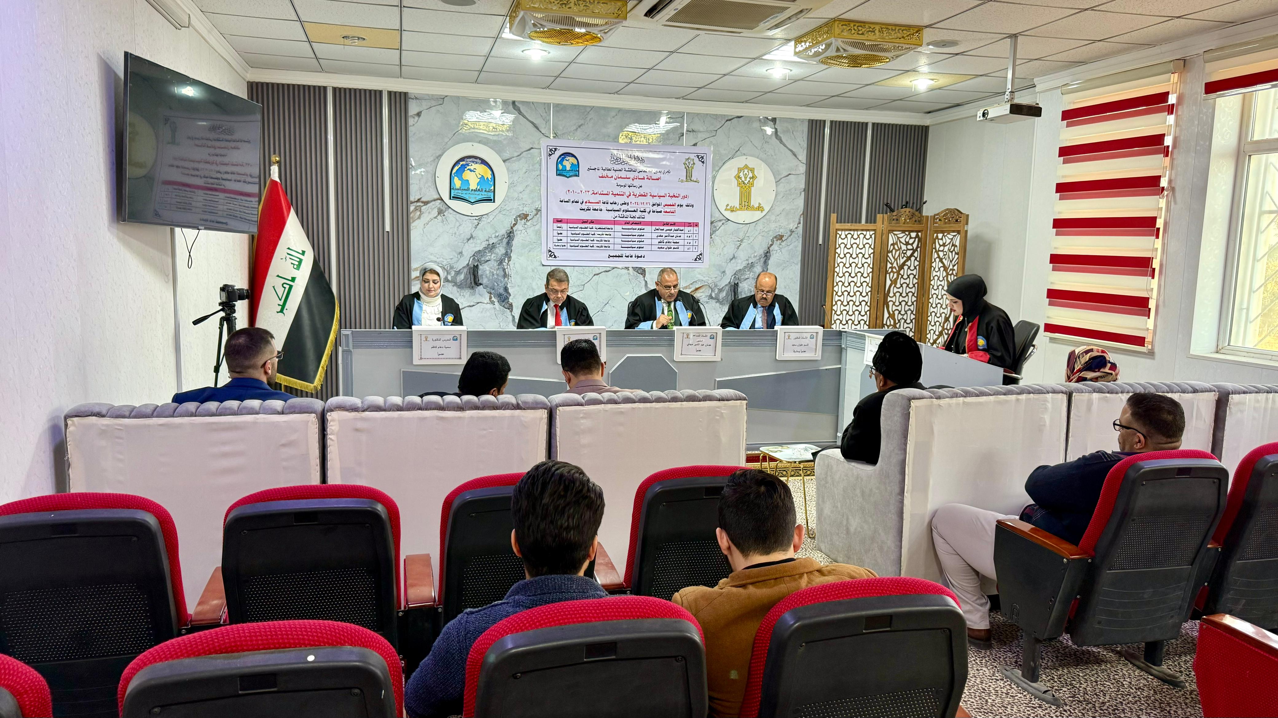 حضر المناقشة السيد المعاون الإداري م.د. حمادي حسن عطية والسيد رئيس فرع الدراسات الدولية ا.د. مثنى فائق مرعي والسيد رئيس فرع النظم السياسية ا.م.د. ناصر زين العابدين احمد وعدد من تدريسيي الكلية وموظفيها.