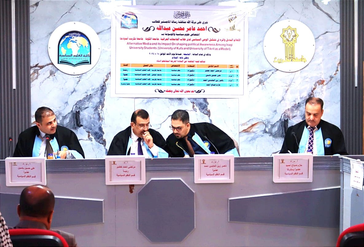 نوقشت في كلية العلوم السياسية رسالة الماجستير الموسومة بـ(العلاقات العراقية - العربية بعد 2014 مصر والاردن انموذجا) للطالبة خنساء سحاب احمد على قاعة السلام اليوم الاثنين الموافق 27/10/2025.