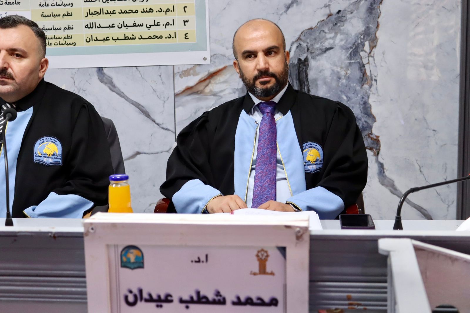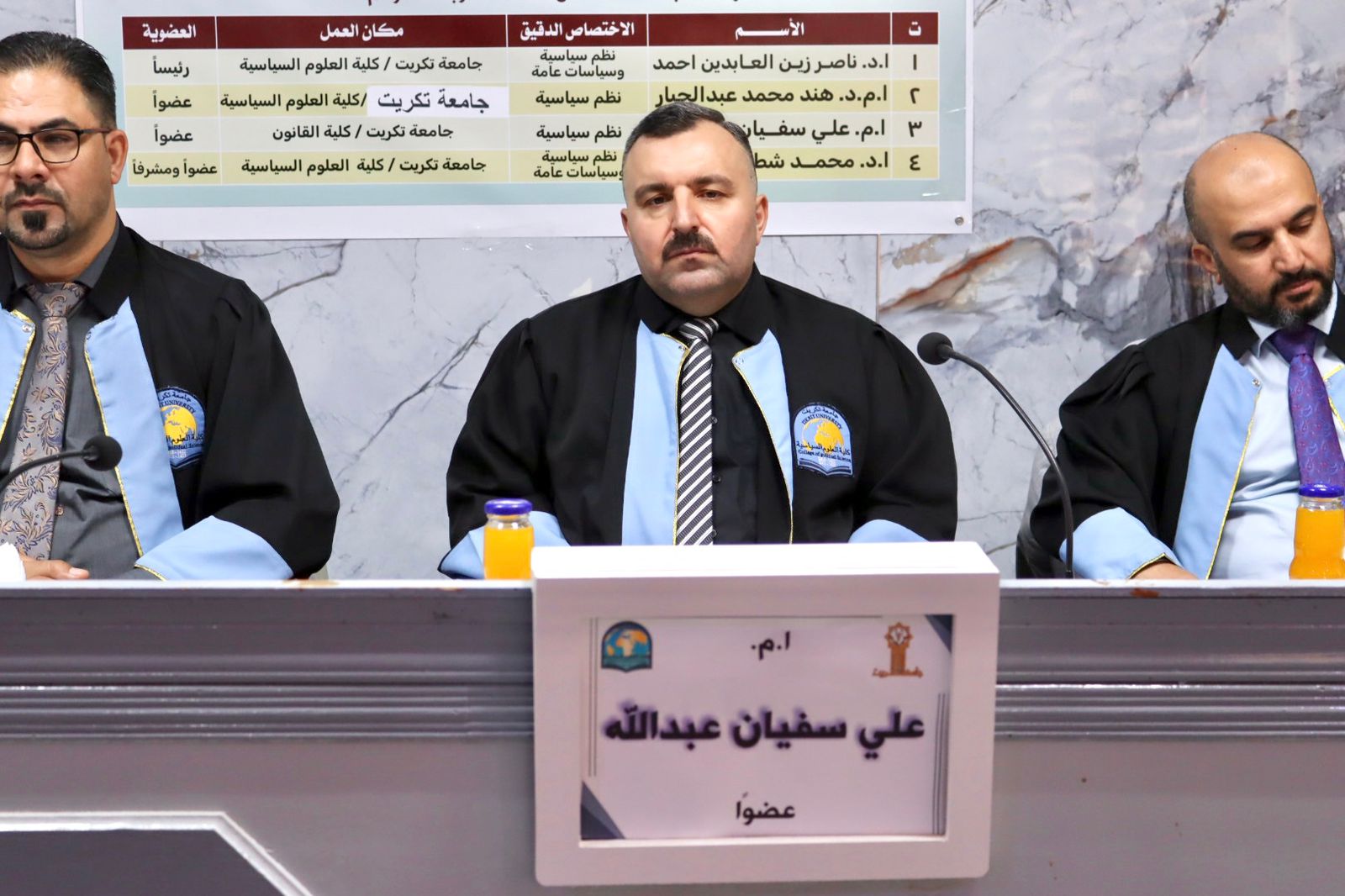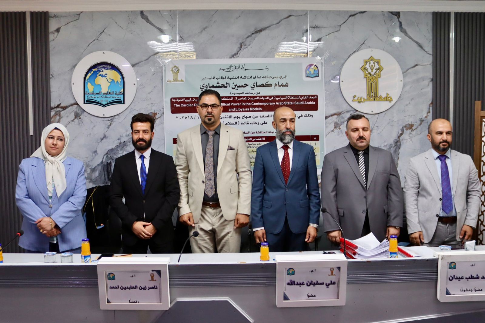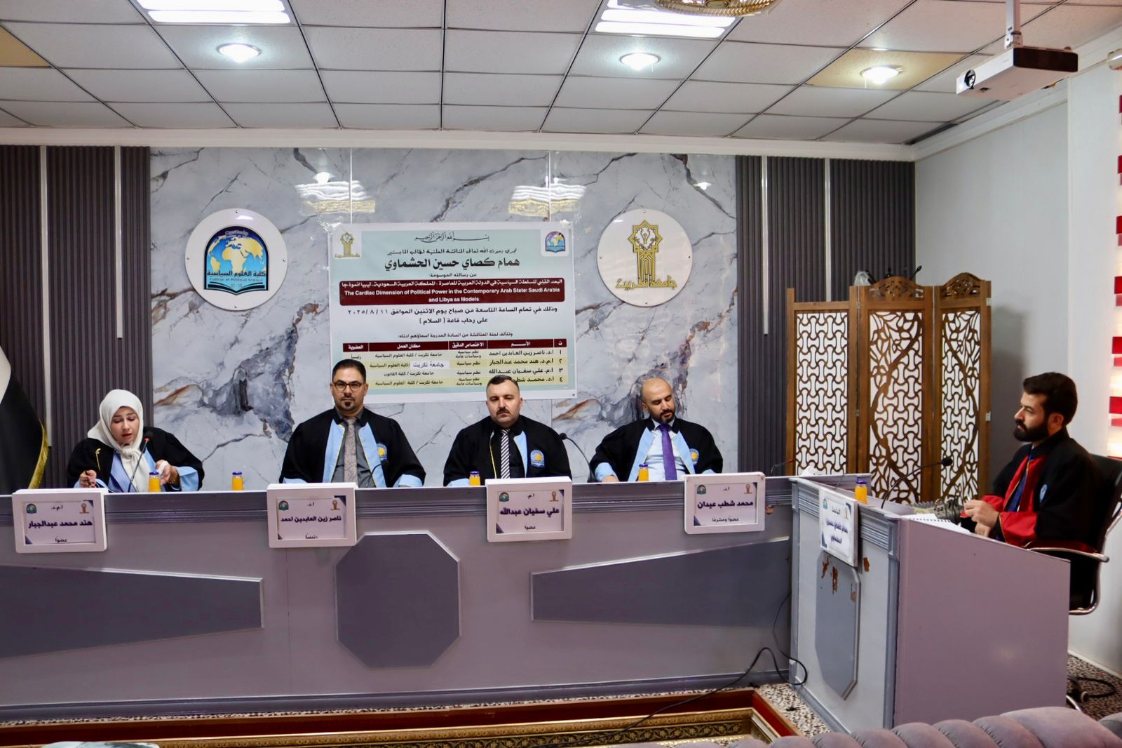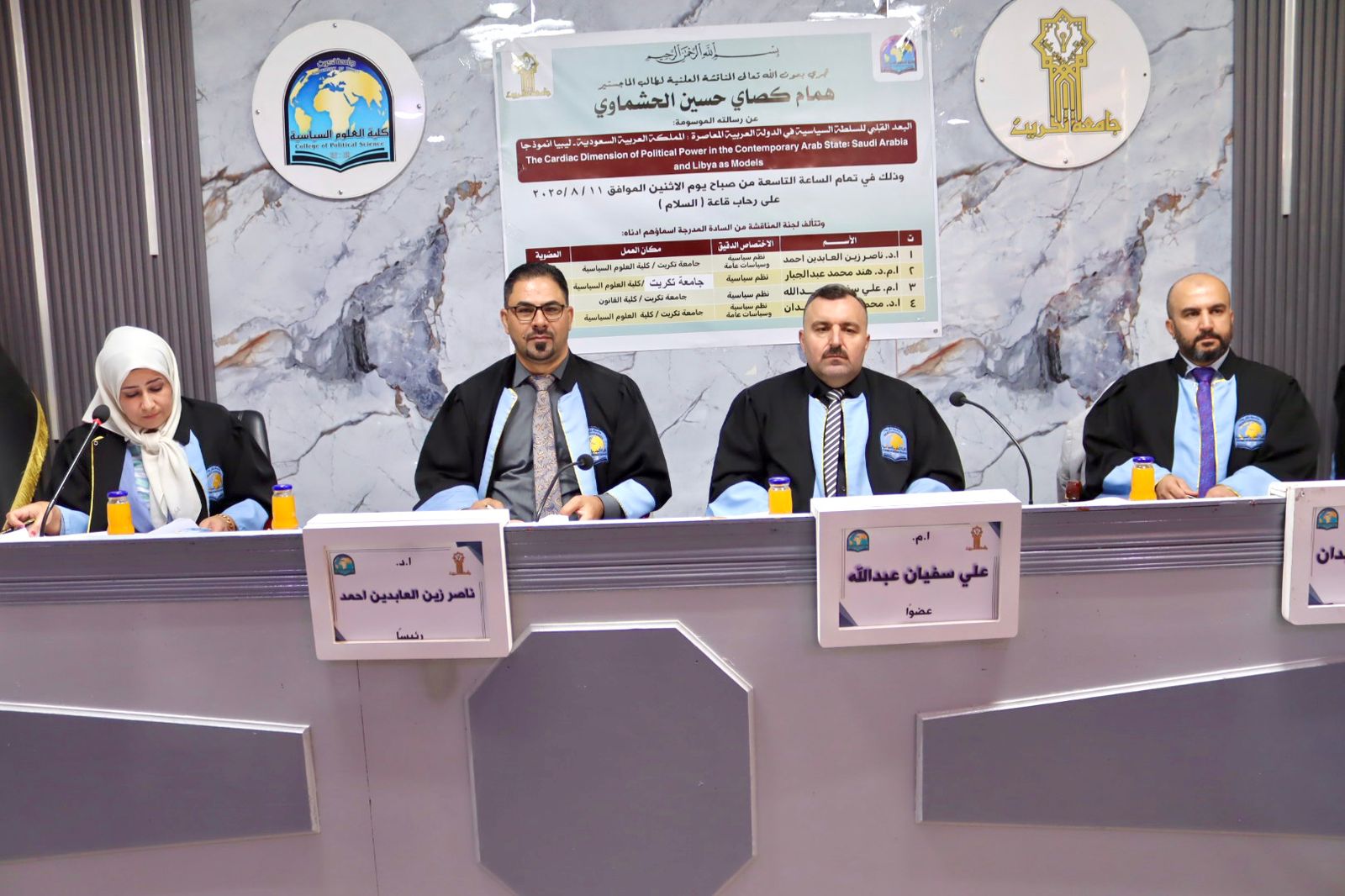 نوقشت في كلية العلوم السياسية رسالة الماجستير الموسومة بـ(البعد القبلي للسلطة السياسية في الدولة العربية المعاصرة المملكة العربية السعودية - ليبيا أنموذجاً) للطالب همام كصاي حسين على قاعة السلام اليوم الاثنين الموافق 11/8/2025.