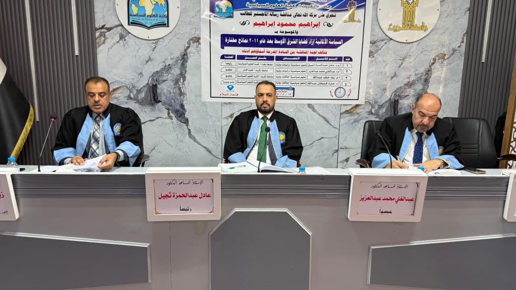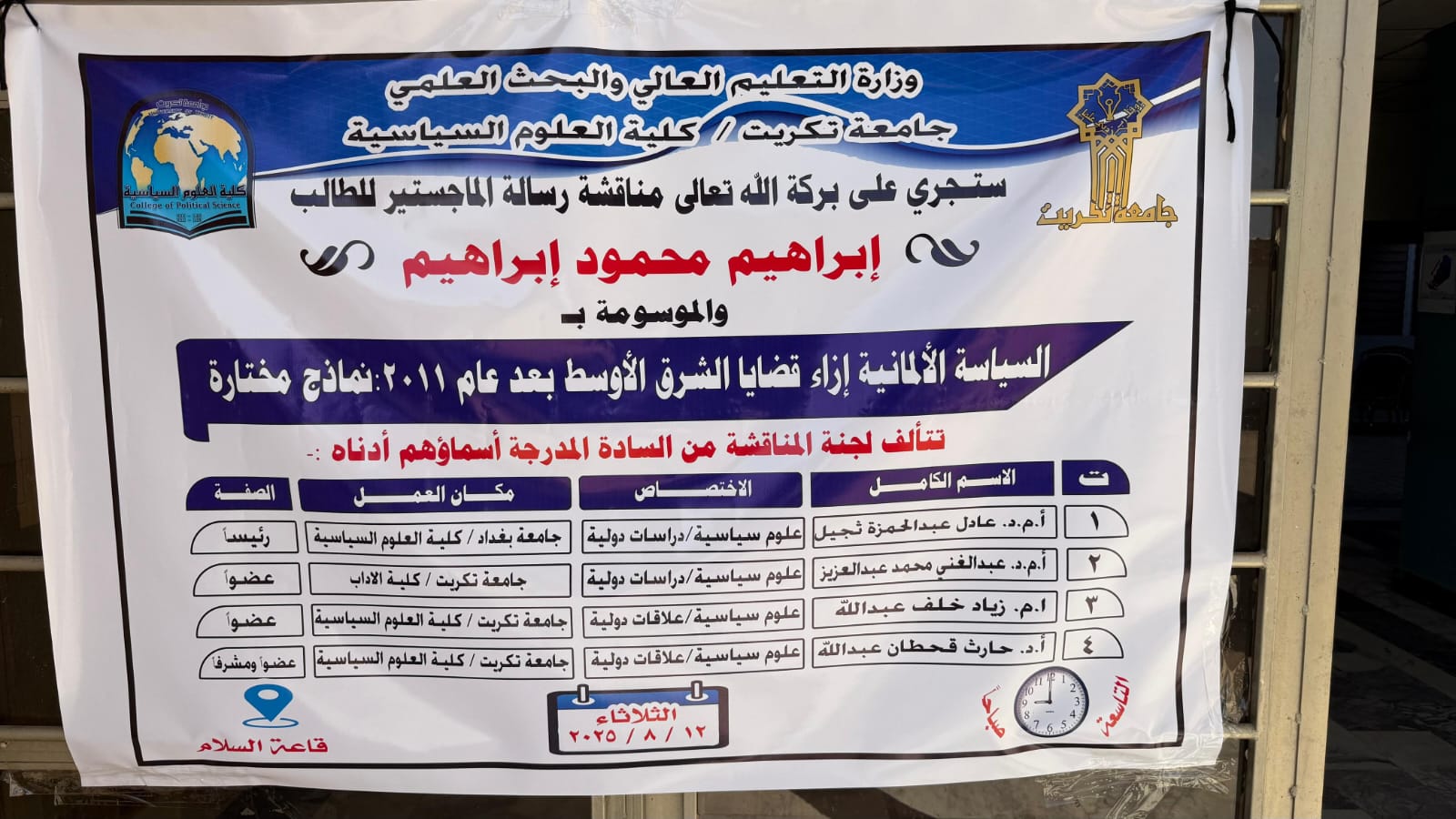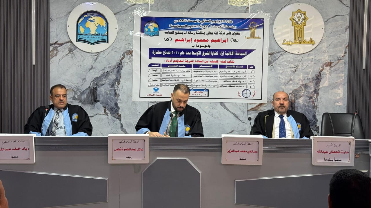 نوقشت في كلية العلوم السياسية رسالة الماجستير الموسومة بـ(السياسة الالمانية ازاء قضايا الشرق الأوسط بعد عام 2011"نماذج مختارة") للطالب إبراهيم محمود ابراهيم على قاعة السلام اليوم الثلاثاء الموافق 12/8/2025.