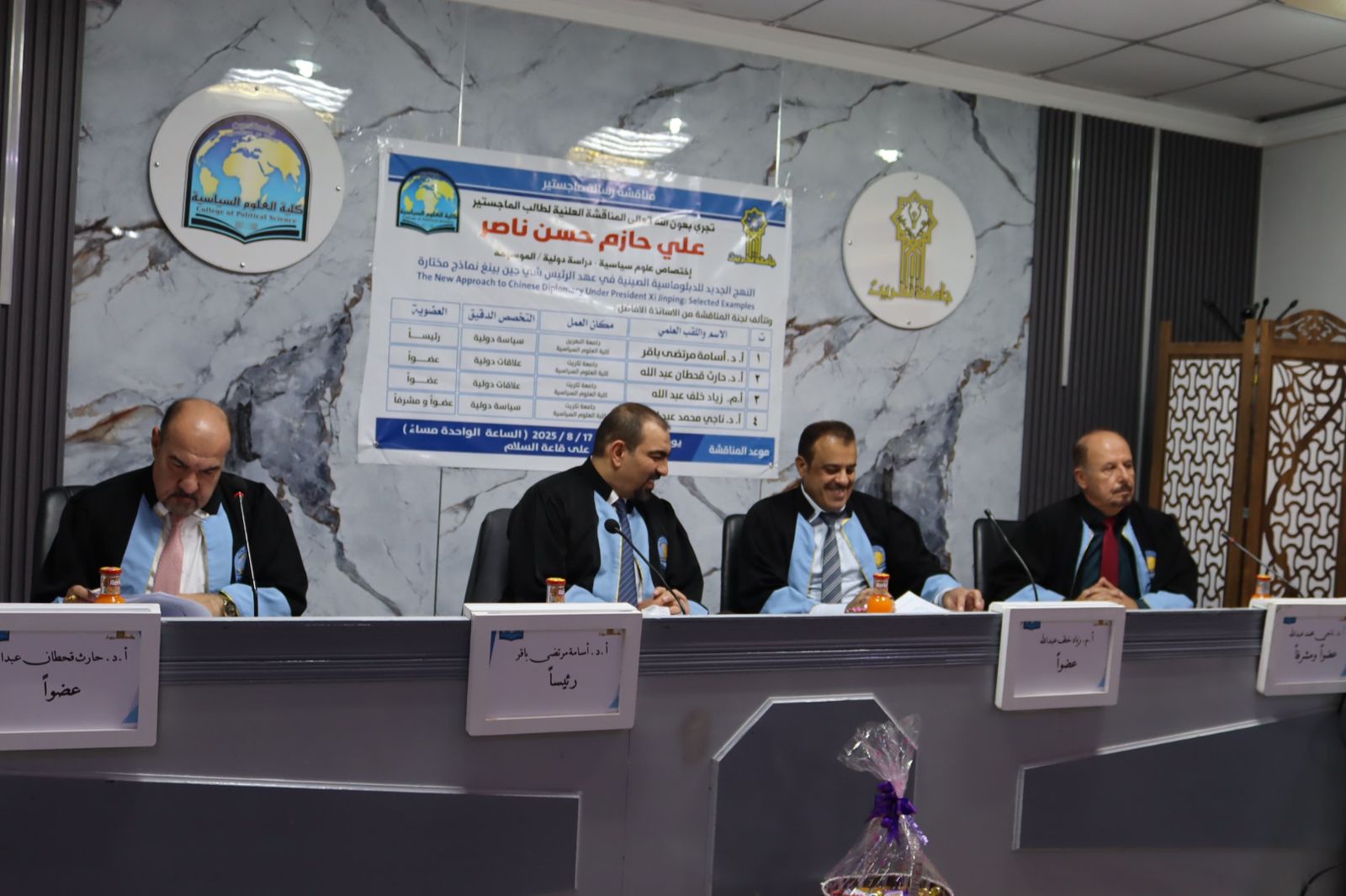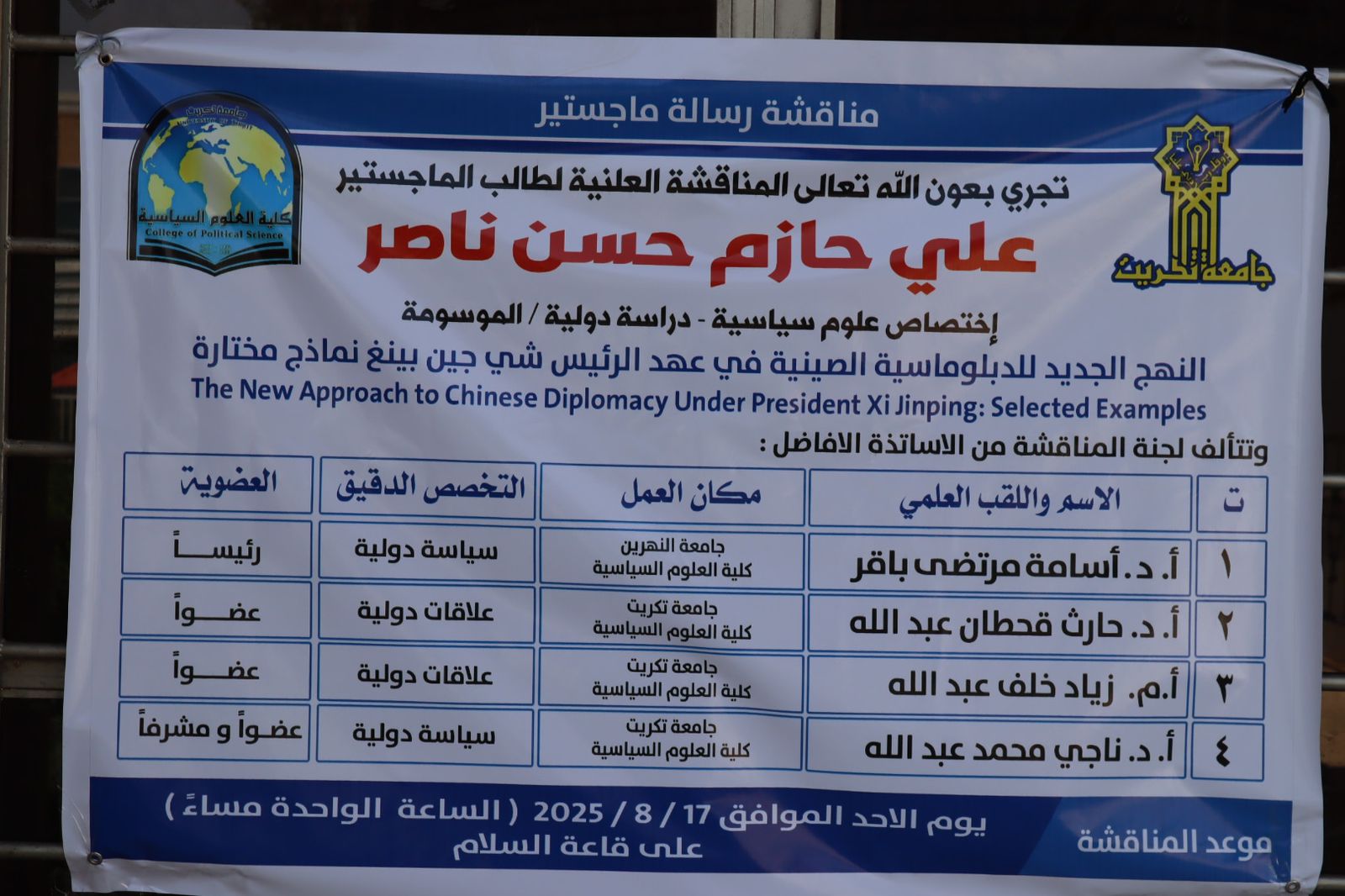 نوقشت في كلية العلوم السياسية جامعة تكريت وبمشاركة السيد عميد كلية العلوم السياسية جامعة النهرين أ. د. أسامة مرتضى باقر رسالة الماجستير الموسومة بـ(النهج الجديد للدبلوماسية الصينية في عهد الرئيس شي جين بينغ: نماذج مختارة) للطالب علي حازم حسن ناص على قاعة السلام اليوم الاحد الموافق 17/8/2025.