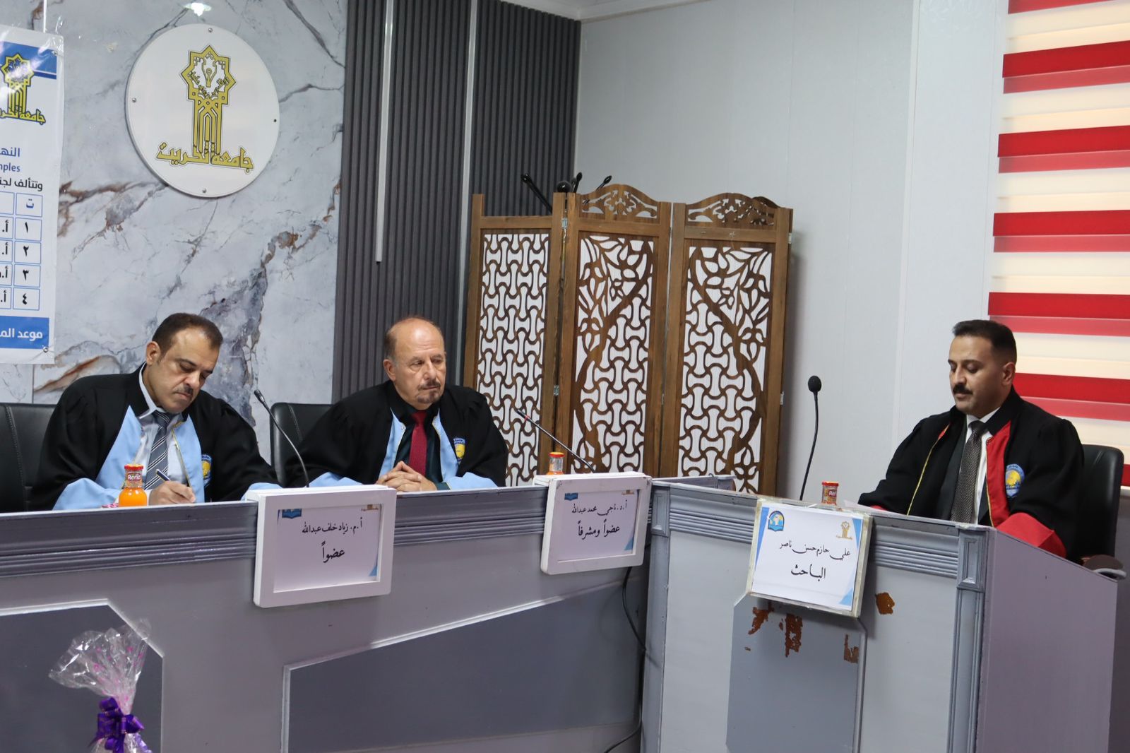 حضر المناقشة السيد عميد الكلية أ.د. قاسم علوان سعيد والسادة معاوني العميد العلمي والاداري وعدد من تدريسيي الكلية وموظفيها وطلبتها.