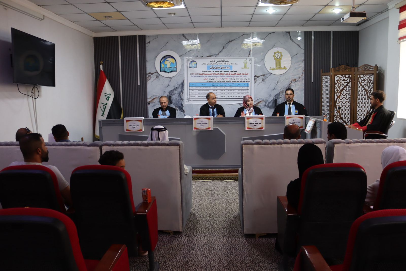 نوقشت في كلية العلوم السياسية رسالة الماجستير الموسومة بـ(أزمة بناء الدولة الليبية في ظل اختلاف التيارات السياسية (2011-2024)) للطالب رعد سفيان خليل على قاعة السلام اليوم الثلاثاء الموافق 19/8/2025.