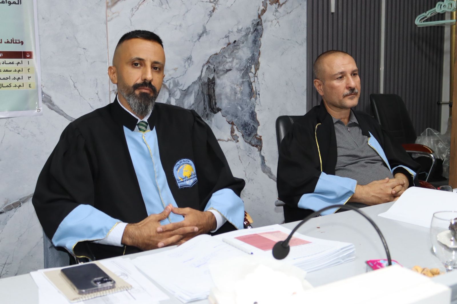 حضر المناقشة السيد عميد الكلية الأستاذ الدكتور قاسم علوان سعيد والسادة معاوني العميد العلمي والإداري وعدد من تدريسيي الكلية وموظفيها وطلبتها.