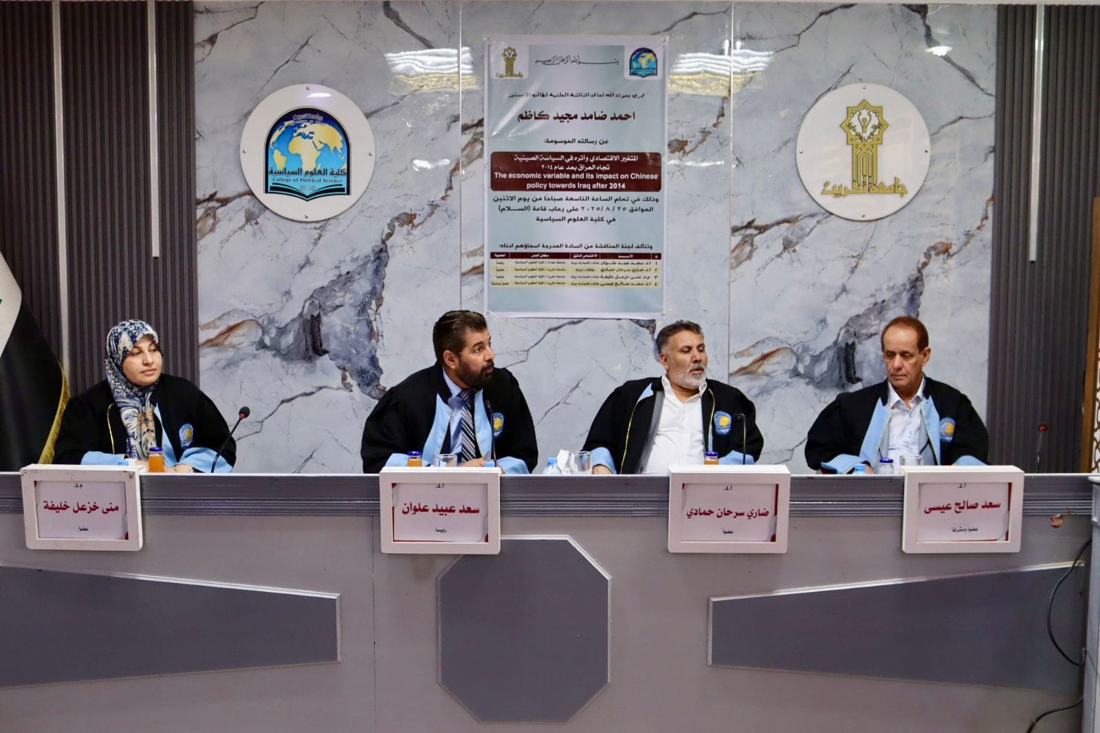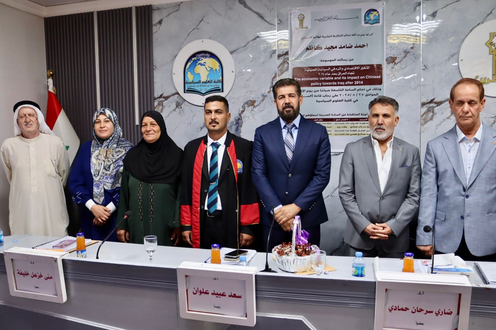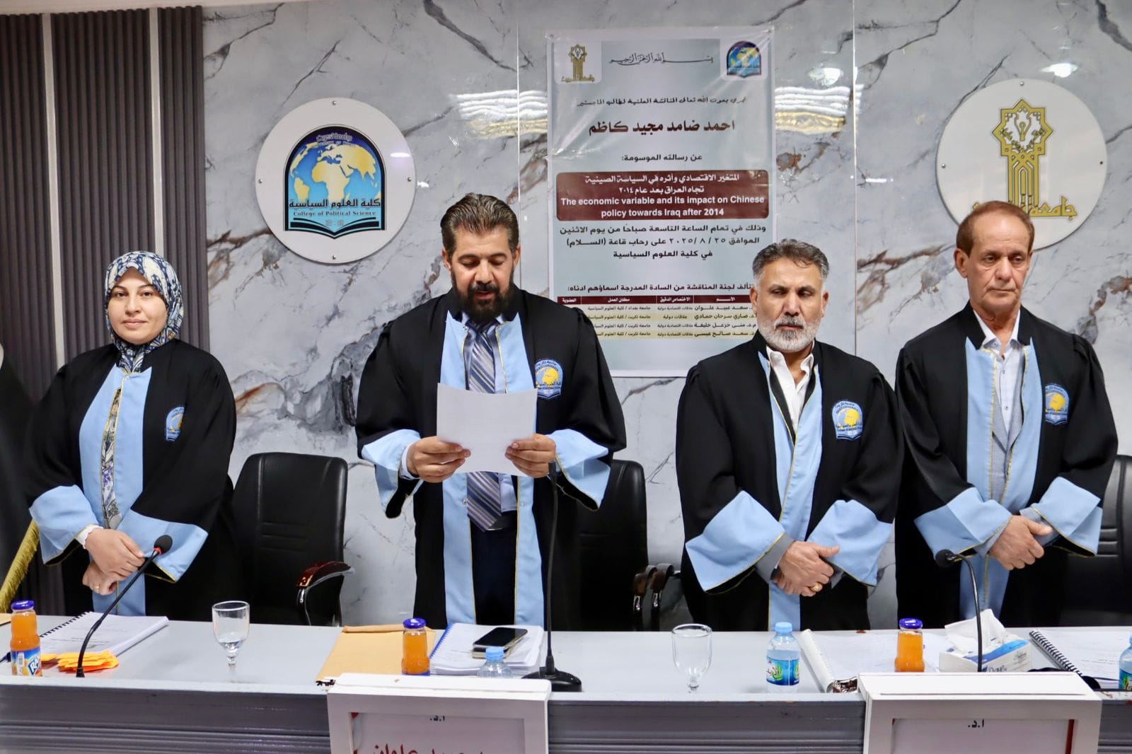 نوقشت في كلية العلوم السياسية رسالة الماجستير الموسومة بـ(المتغير الاقتصادي وأثره في السياسة الصينية تجاه العراق بعد عام 2014 للطالب احمد ضامد مجيد على قاعة السلام اليوم الاثنين الموافق 25/8/2025.