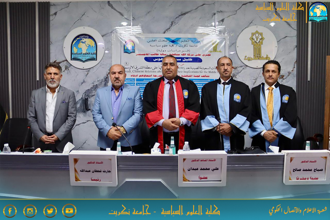 نوقشت في كلية العلوم السياسية رسالة الماجستير الموسومة بـ(العلاقات السعودية الصينية بعد عام 2015 وانعكاساتها على منطقة الشرق الأوسط) للطالب خليل سبهان مهوس على قاعة السلام اليوم الاحد الموافق 3/8/2025.