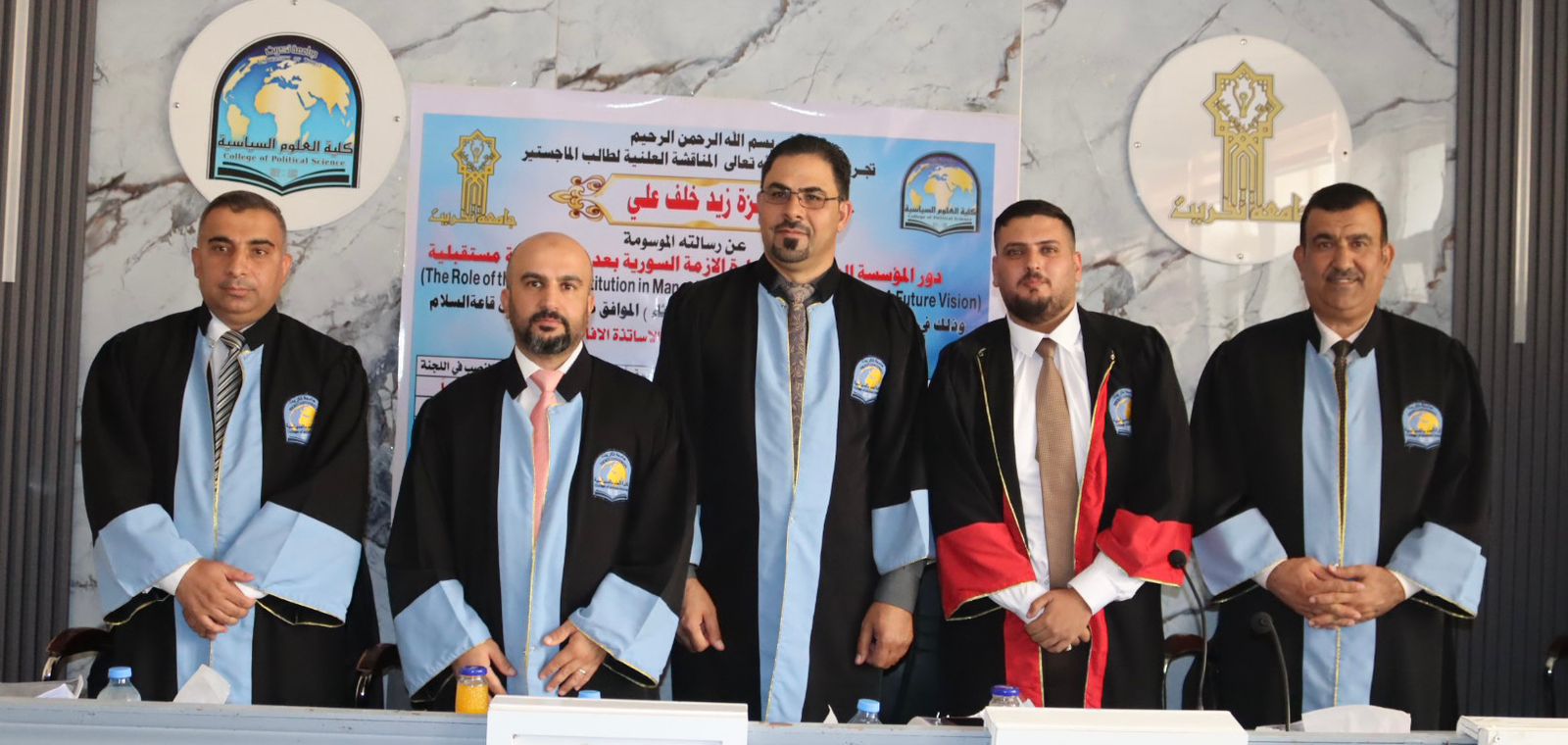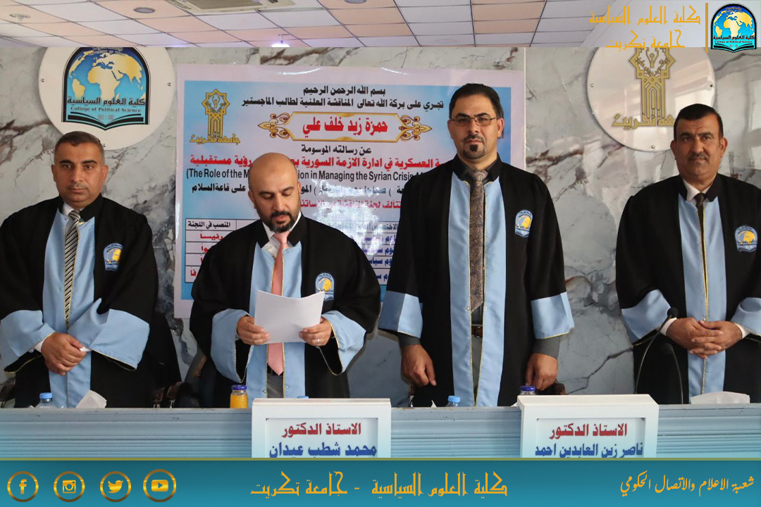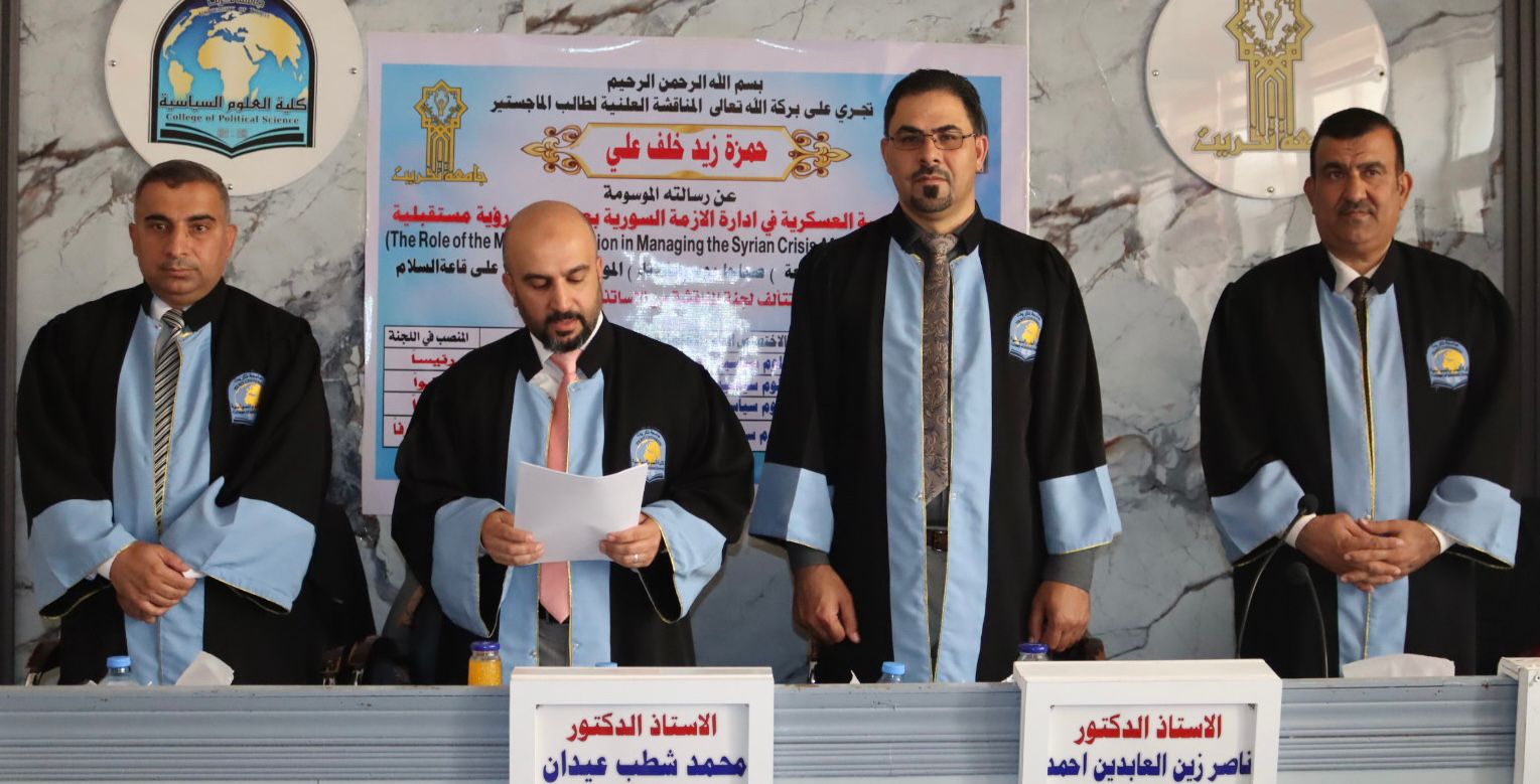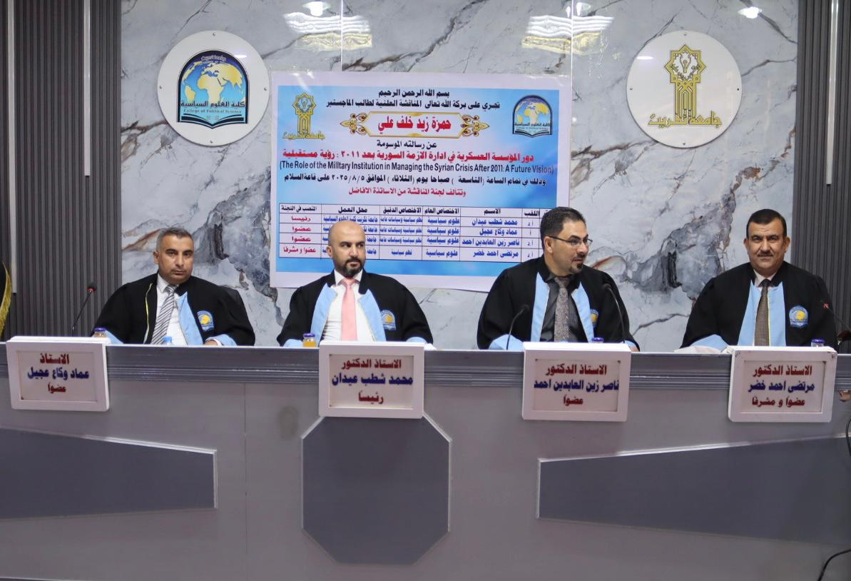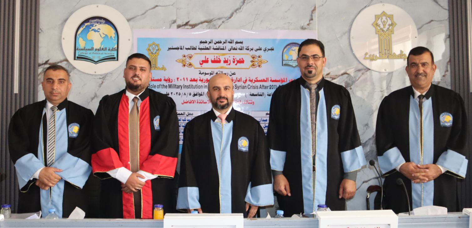 نوقشت في كلية العلوم السياسية رسالة الماجستير الموسومة بـ(دور المؤسسة العسكرية في إدارة الازمة السورية بعد عام 2011: رؤية مستقبلية) للطالب حمزة زيد خلف على قاعة السلام اليوم الاثنين الموافق 5/8/2025.