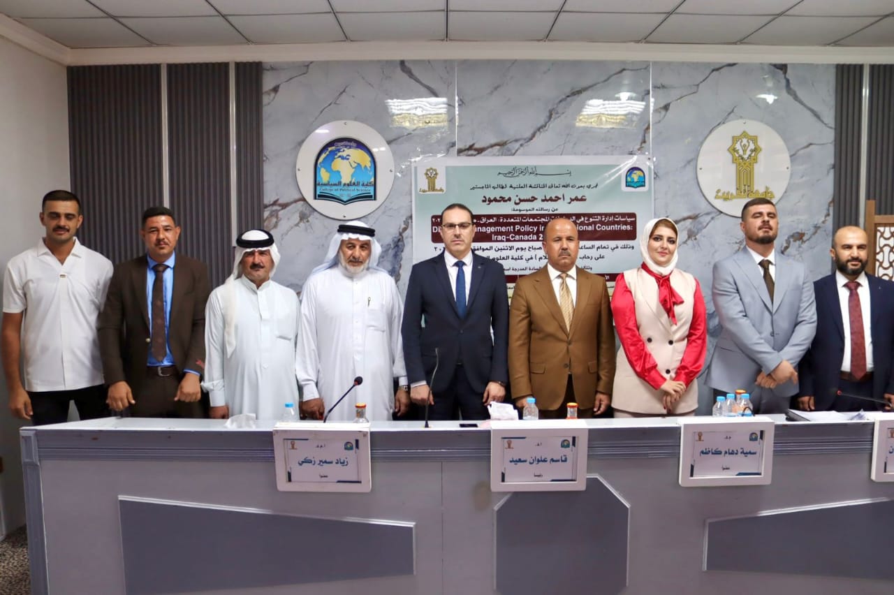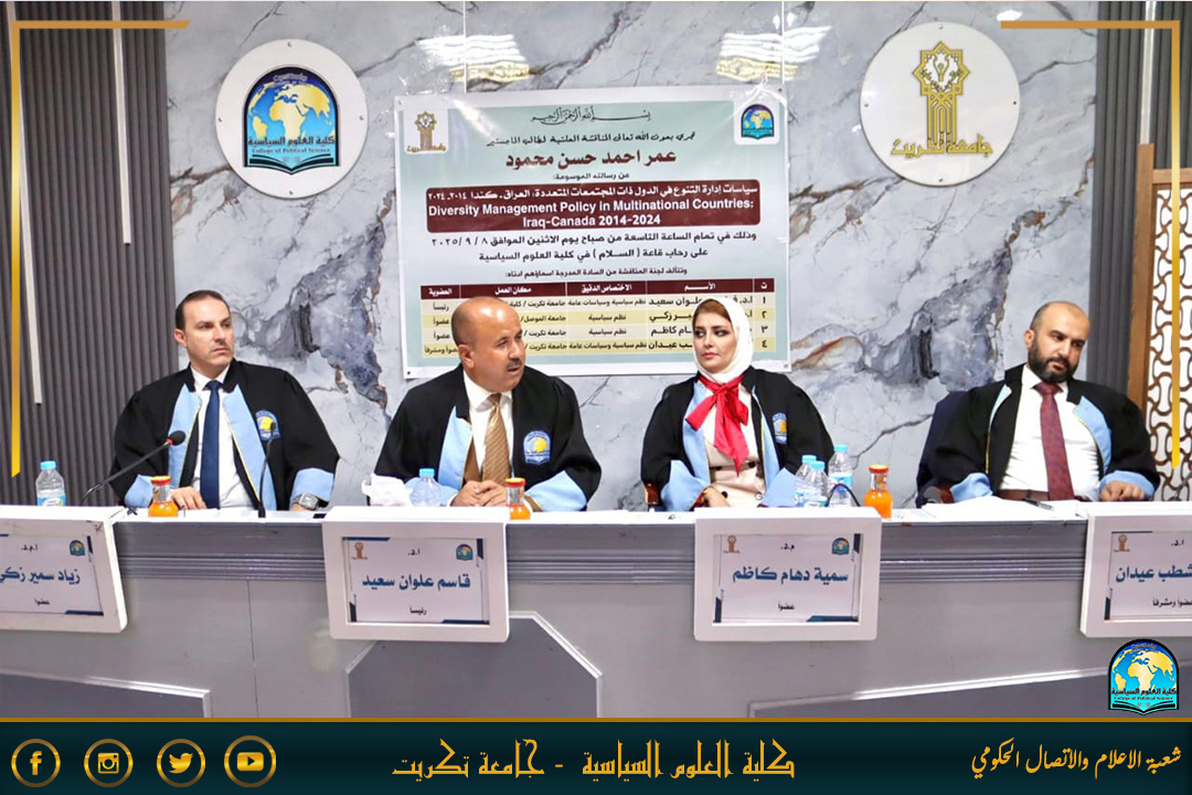 نوقشت في كلية العلوم السياسية رسالة الماجستير الموسومة بـ(سياسات ادارة التنوع في الدول ذات المجتمعات المتعددة : العراق وكندا 2014 - 2024) للطالب عمر احمد حسن على قاعة السلام اليوم الاثنين الموافق 8/9/2025.