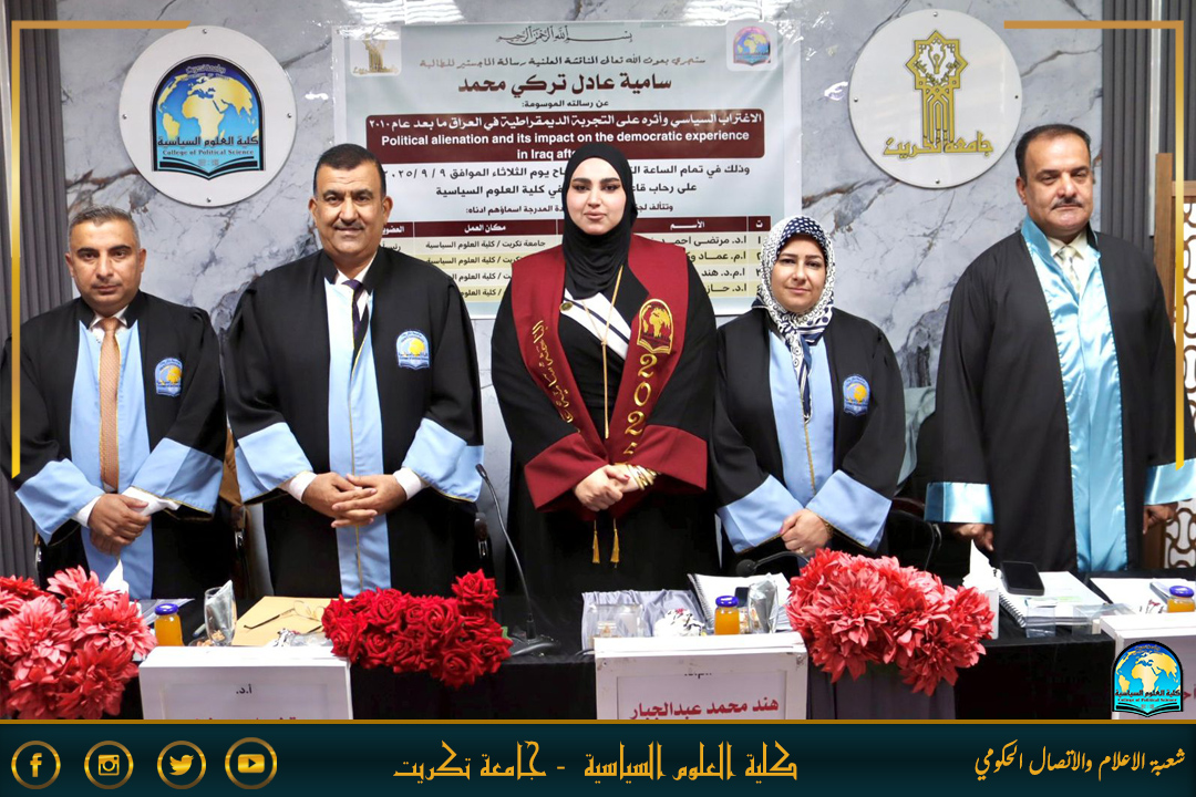 نوقشت في كلية العلوم السياسية رسالة الماجستير الموسومة بـ(الاغتراب السياسي واثره على التجربة الديمقراطية في العراق ما بعد عام 2010) للطالبة سامية عادل تركي على قاعة السلام اليوم الثلاثاء الموافق 9/9/2025.