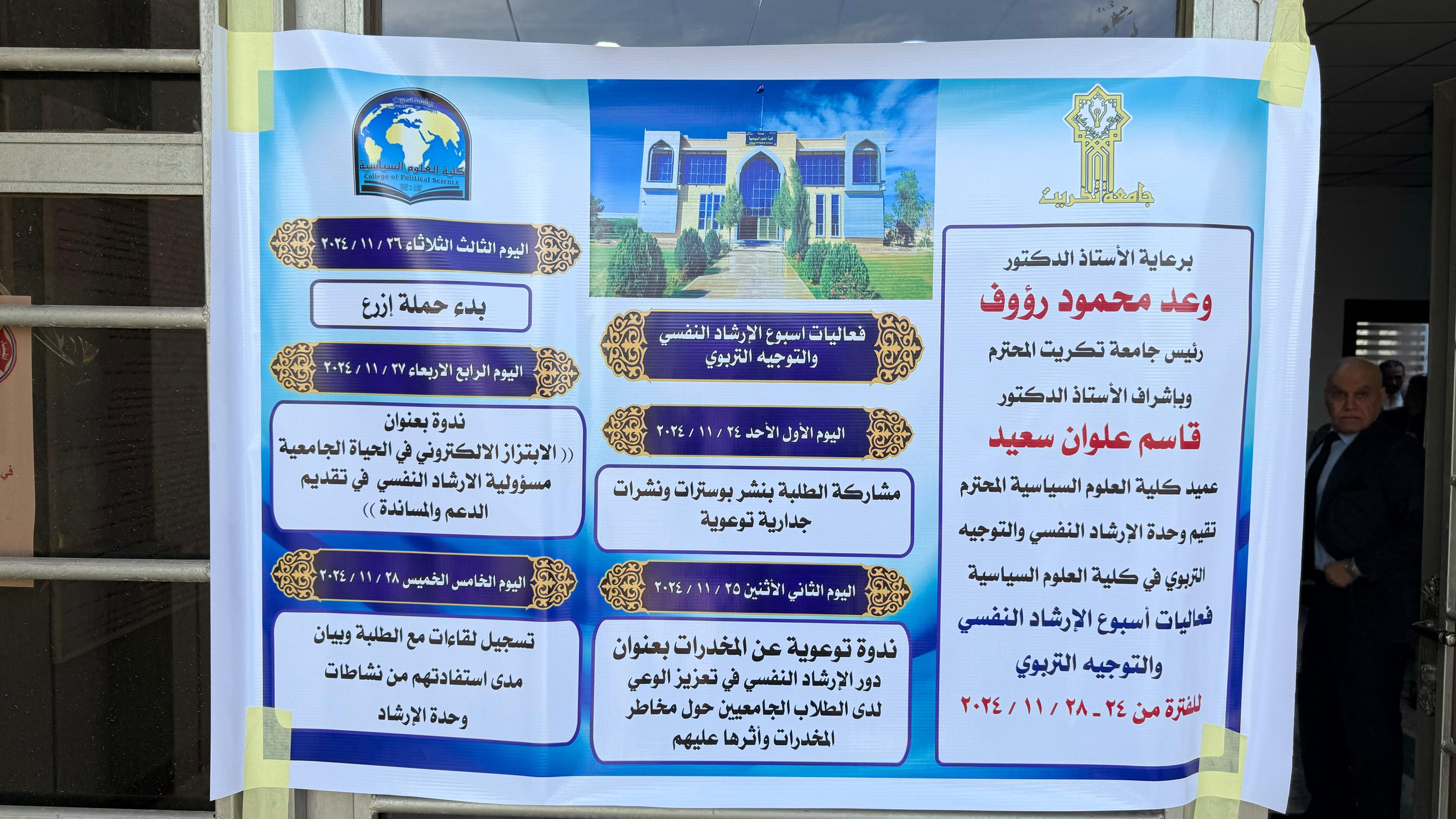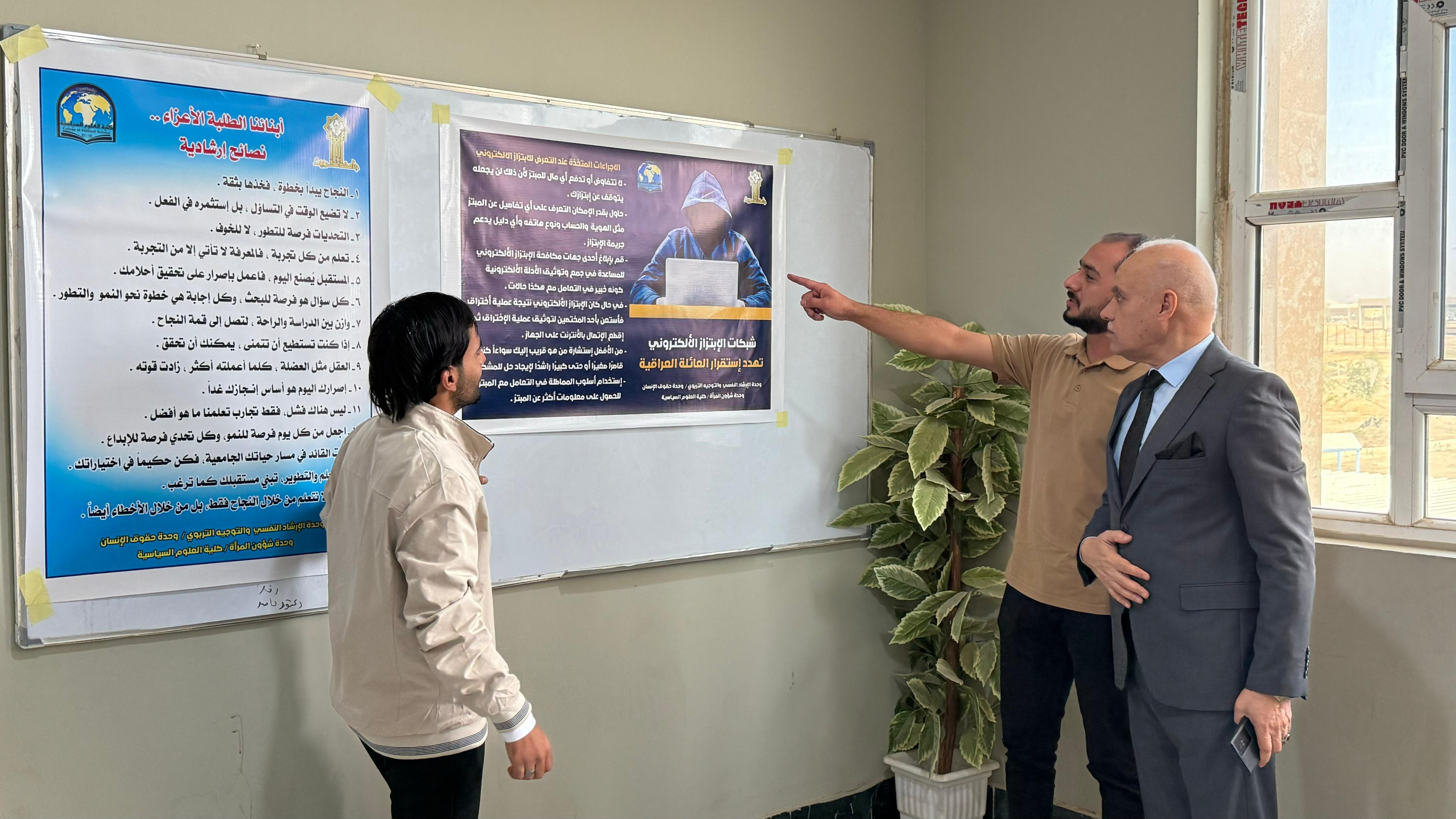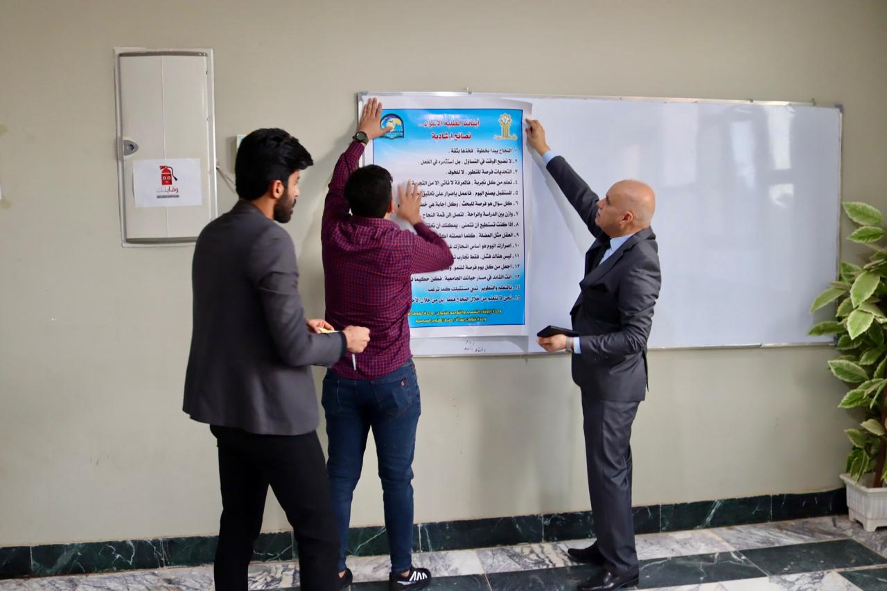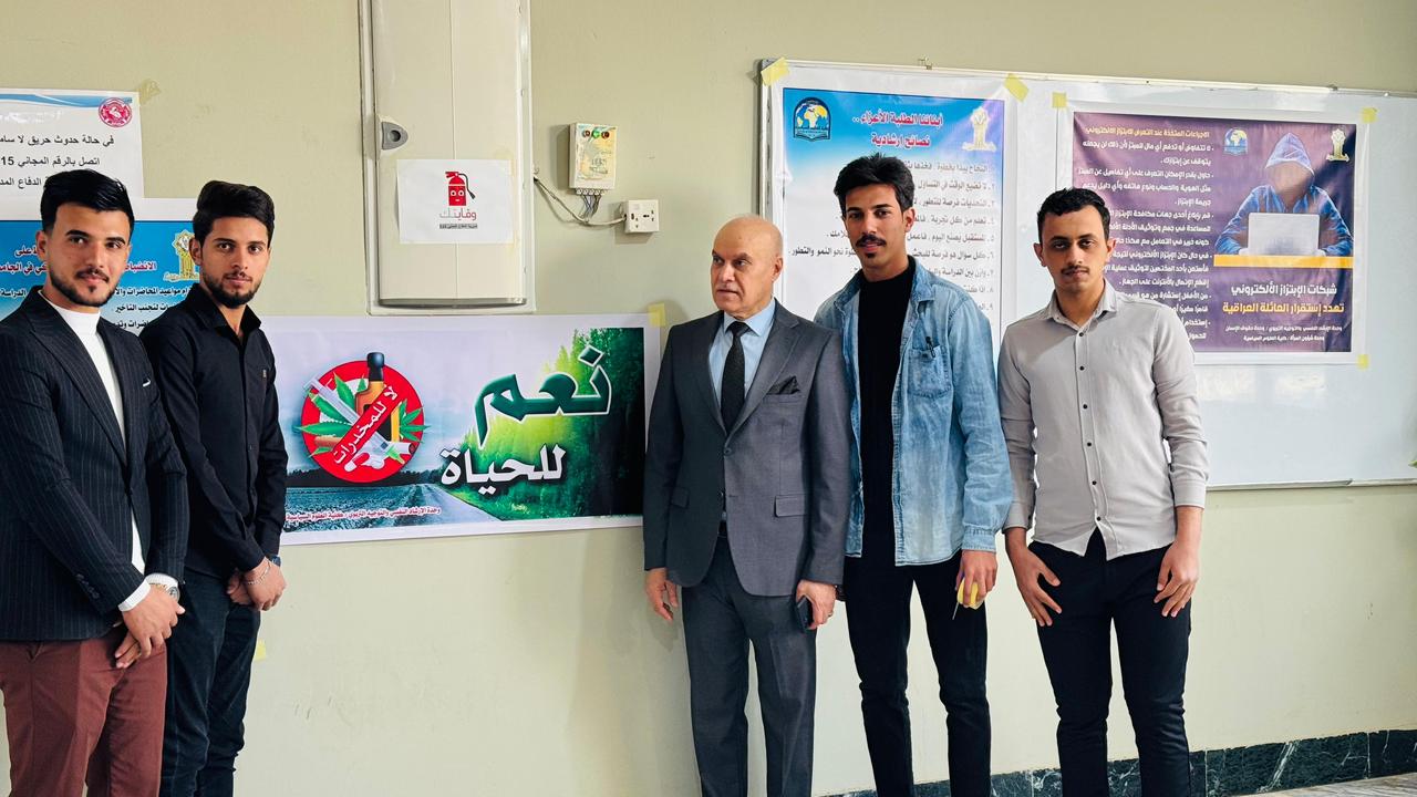 بناءً على توجيهات وزارة التعليم العالي والبحث العلمي وحرصها على ابناءها الطلبة بإقامة أسبوع للإرشاد النفسي والتوجيه التربوي وفي اليوم الاول في سياق برنامج الكلية المخصص لهذا الاسبوع وبرعاية السيد رئيس جامعة تكريت الاستاذ الدكتور وعد محمود رؤوف المحترم واشراف وحضور السيد عميد كلية العلوم السياسية الأستاذ الدكتور قاسم علوان سعيد المحترم والسادة المعاون الإداري دكتور حمادي حسن العطية والمعاون العلمي في الكلية الدكتور حسام كصاي حسين اقامت وحدة الارشاد النفسي والتوجيه التربوي في الكلية برئاسة الدكتور عباس فاضل عطوان وبمشاركة عدد من طلبة الكلية بنشر بوسترات وملصقات جدارية توعوية تضمنت ثلاثة محاور أساسية الأول المخدرات واضرارها وطرق الوقاية منها والمحور الثاني تضمن الابتزاز الالكتروني وكيفية التصدي له والمحور الثالث تناول موضوع الانضباط والسلوك الجامعي المثالي للطالب في الجامعة.