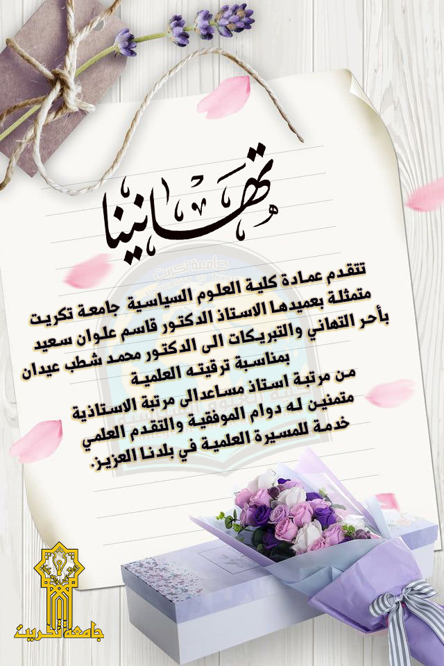 تتقدم عمادة كلية العلوم السياسية – جامعة تكريت متمثلة بعميدها الاستاذ الدكتور قاسم علوان سعيد بأحر التهاني والتبريكات الى الدكتور محمد شطب عيدان بمناسبة ترقيته العلمية من مرتبة استاذ مساعد الى مرتبة استاذ متمنين له دوام الموفقية والتقدم العلمي خدمة للمسيرة العلمية في بلدنا العزيز.