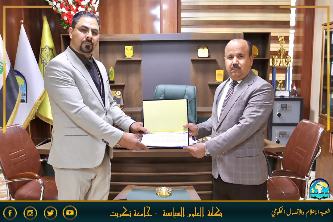 تتقدم عمادة الكلية وأسرتها التدريسية والوظيفية بأسمى آيات التهنئة والتبريكات إلى الأستاذ الدكتور ناصر زين العابدين أحمد بمناسبة تسنمه منصب معاون العميد للشؤون الإدارية، وإلى الأستاذ المساعد الدكتور نزار عبد الكريم حسن بمناسبة مباشرته مهام رئيس فرع النظم السياسية. وإذ نبارك لهما هذه الثقة، نسأل الله لهما السداد والتوفيق في مواصلة مسيرة الارتقاء بالكلية وتحقيق أهدافها الاستراتيجية.