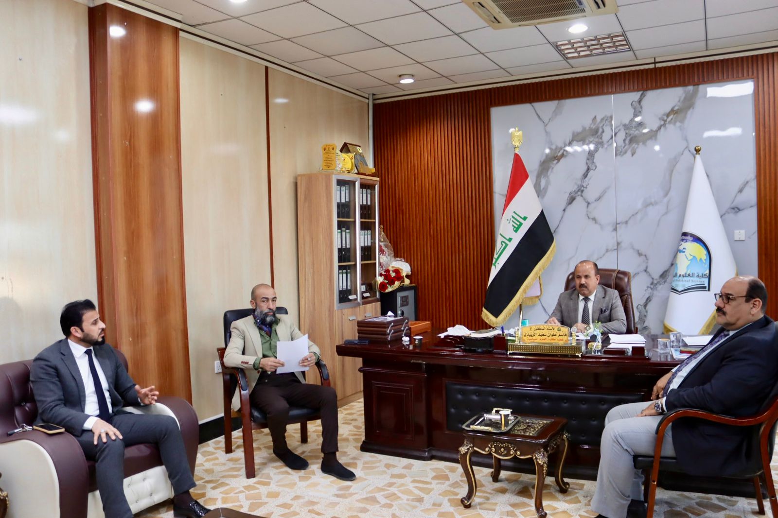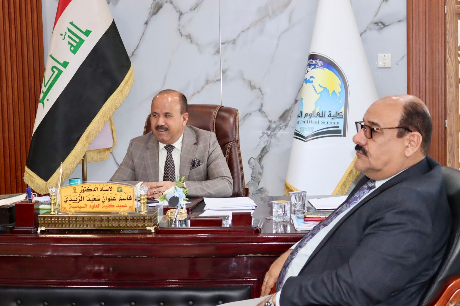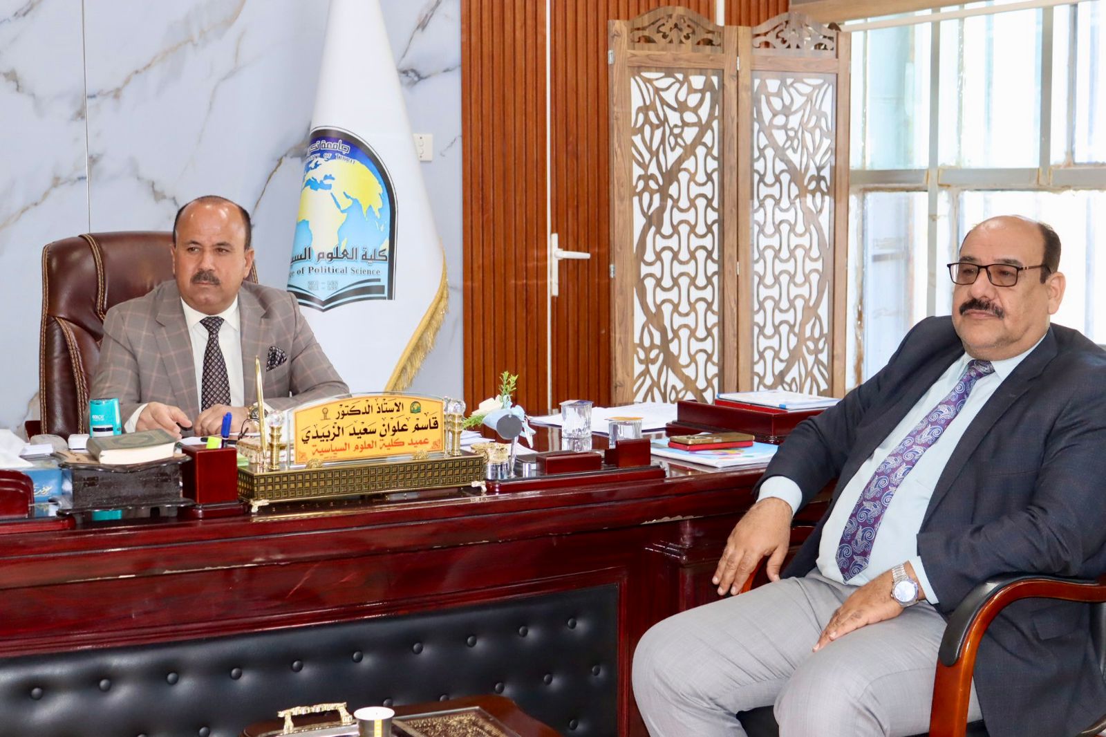 استقبل الأستاذ الدكتور قاسم علوان سعيد عميد كلية العلوم السياسية في مكتبه اليوم الثلاثاء كل من الاستاذ الدكتور مثنى مشعان الزبيدي معاون عميد كلية التربية للعلوم الإنسانية لشؤون الطلبة والاستاذ المساعد الدكتور سالم خلف فهد معاون عميد كلية التربية البدنية وعلوم الرياضية للشؤون الإدارية.