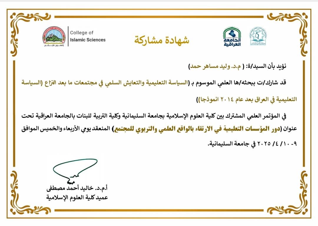 شارك كل من الدكتور وليد مساهر حمد والدكتور ظاهر عبدالله علوان ببحثهم الموسوم بـ"السياسية التعليمية والتعايش السلمي في مجتمعات ما بين النزاع (السياسة التعليمية في العراق بعد عام 2014 انموذجا)" في المؤتمر العلمي المشترك بين كلية العلوم الإسلامية في جامعة السليمانية وكلية التربية للبنات الجامعة العراقية الذي أقيم تحت عنوان "دور المؤسسات التعليمية في الارتقاء بالواقع العلمي والتربوي للمجتمع" يومي الاربعاء والخميس الموافق 9-10/4/2025 في جامعة السليمانية.