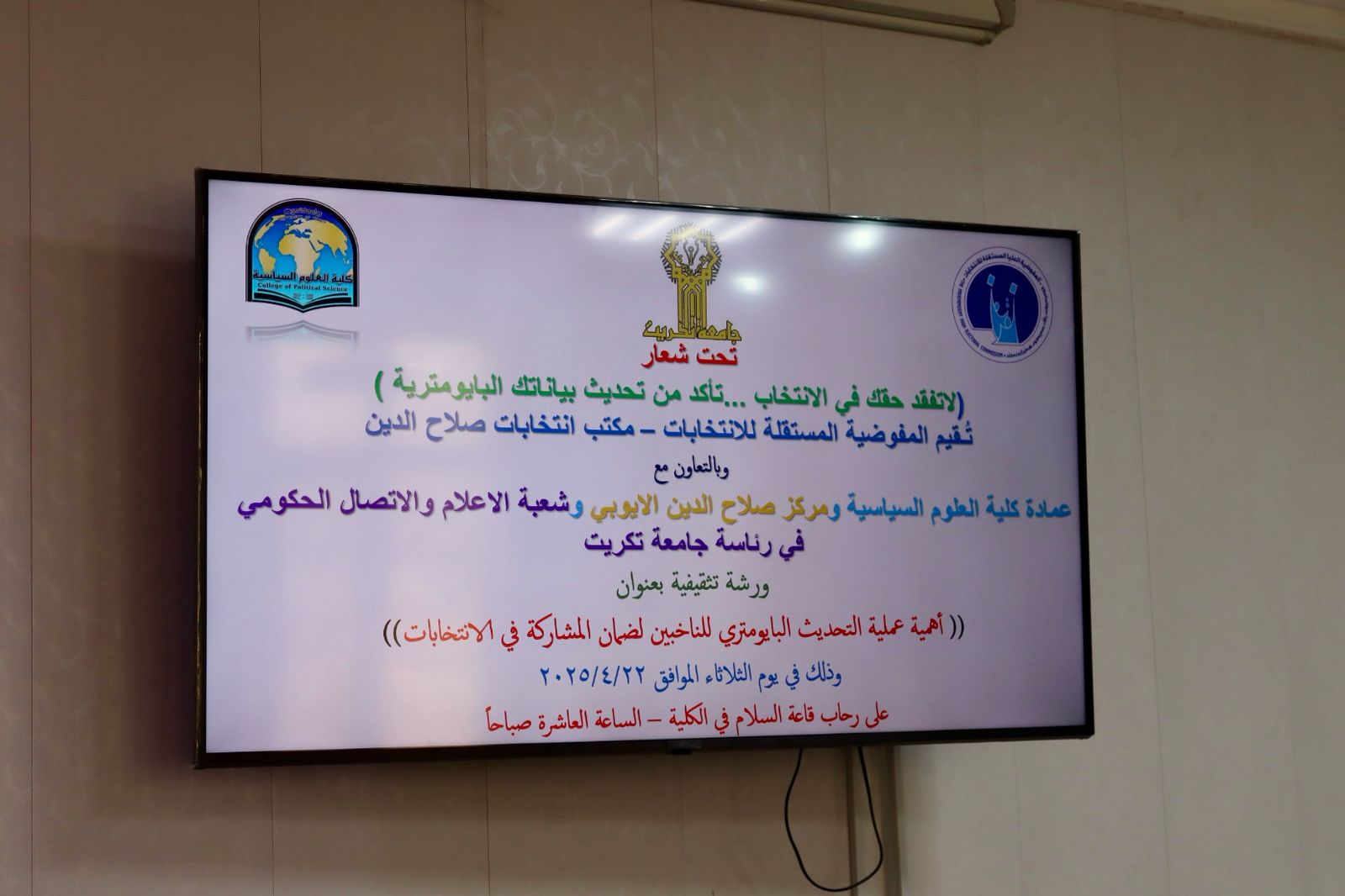 اقامت كلية العلوم السياسية بالتعاون مع المفوضية العليا للانتخابات في محافظة صلاح ومع مركز صلاح الدين الأيوبي للدراسات التاريخية والحضارية ومركز التعليم المستمر وشعبة الإعلام والاتصال الحكومي دورة علمية عن "أهمية عملية التحديث البايومتري للناخبين في ضمان المشاركة في الانتخابات".