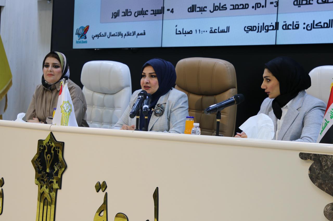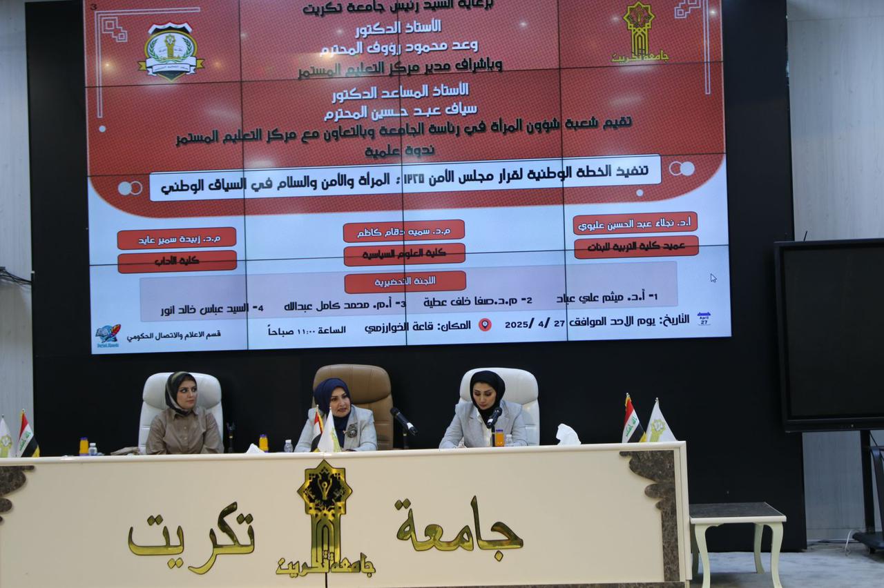 برعاية الاستاذ الدكتور وعد محمود رؤوف رئيس جامعة تكريت، شاركت الدكتورة سميه دهام كاظم مسؤول وحدة شؤون المرأة بكليتنا في الندوة التي أقامتها شعبة شؤون المرأة في رئاسة الجامعة ومركز التعليم المستمر والموسومة "تنفيذ الخطة الوطنية لقرار مجلس الأمن ۱۳۲۵: المرأة والأمن والسلام في السياق الوطني" والتي حاضر فيها الاستاذ الدكتورة نجلاء عبد الحسين عليوي عميد كلية التربية للبنات والدكتورة زبيدة سمير عايد من كلية الاداب.