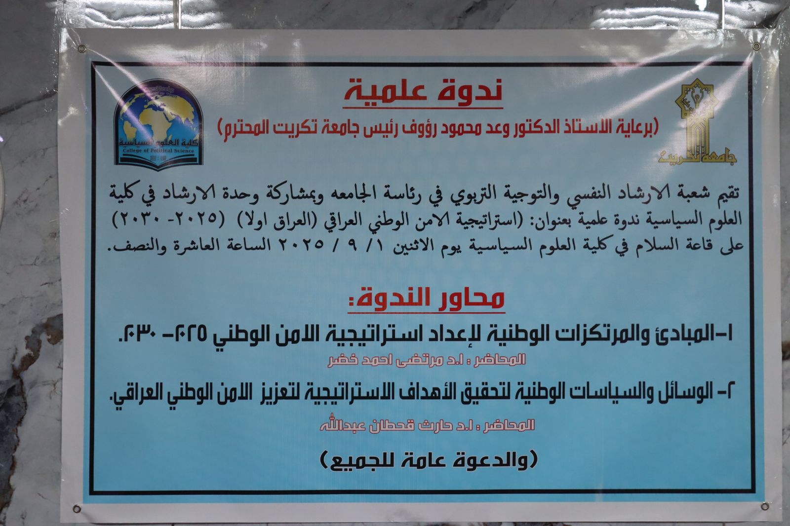 برعاية الاستاذ الدكتور وعد محمود رؤوف رئيس جامعة تكريت المحترم اقامت شعبة الارشاد النفسي والتوجيه التربوي في رئاسة الجامعة وبمشاركة وحدة الارشاد في كلية العلوم السياسية ندوة علمية بعنوان: (استراتيجية الامن الوطني العراقي (العراق اولا) (٢٠٢٥- ٢٠٣٠) على قاعة السلام في كلية العلوم السياسية يوم الاثنين ١/ ٩ / ٢٠٢٥ الساعة العاشرة والنصف.