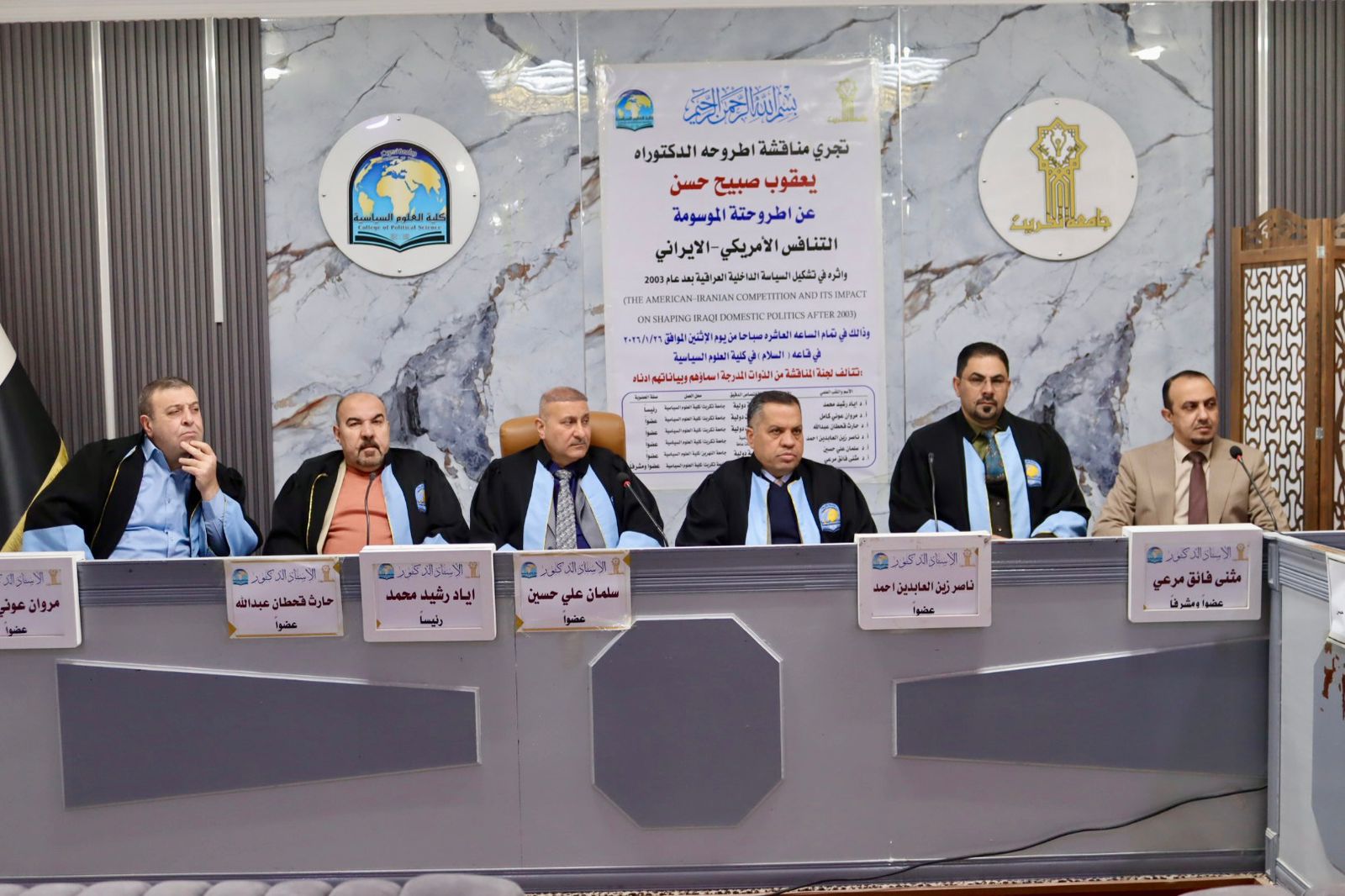 شهدت كلية العلوم السياسية مناقشة أطروحة الدكتوراه للطالب (يعقوب صبيح حسن) عن أطروحته الموسومة: "التنافس الأمريكي- الإيراني وأثره في تشكيل السياسة الداخلية العراقية بعد عام 2003".