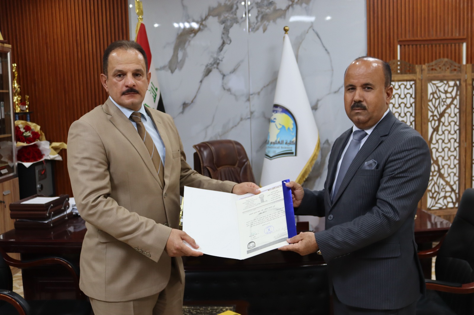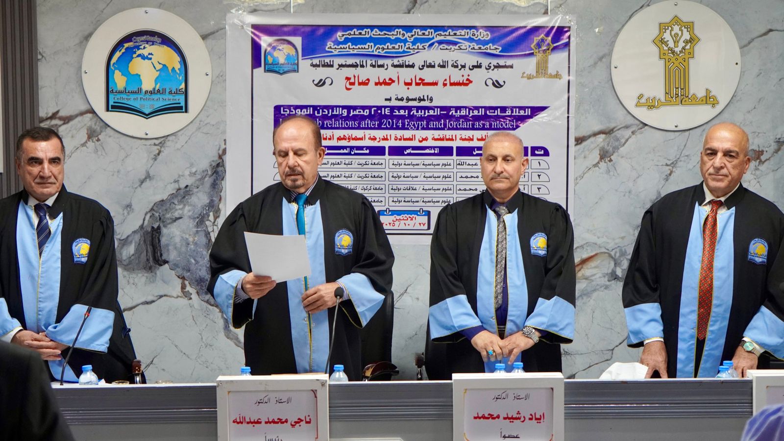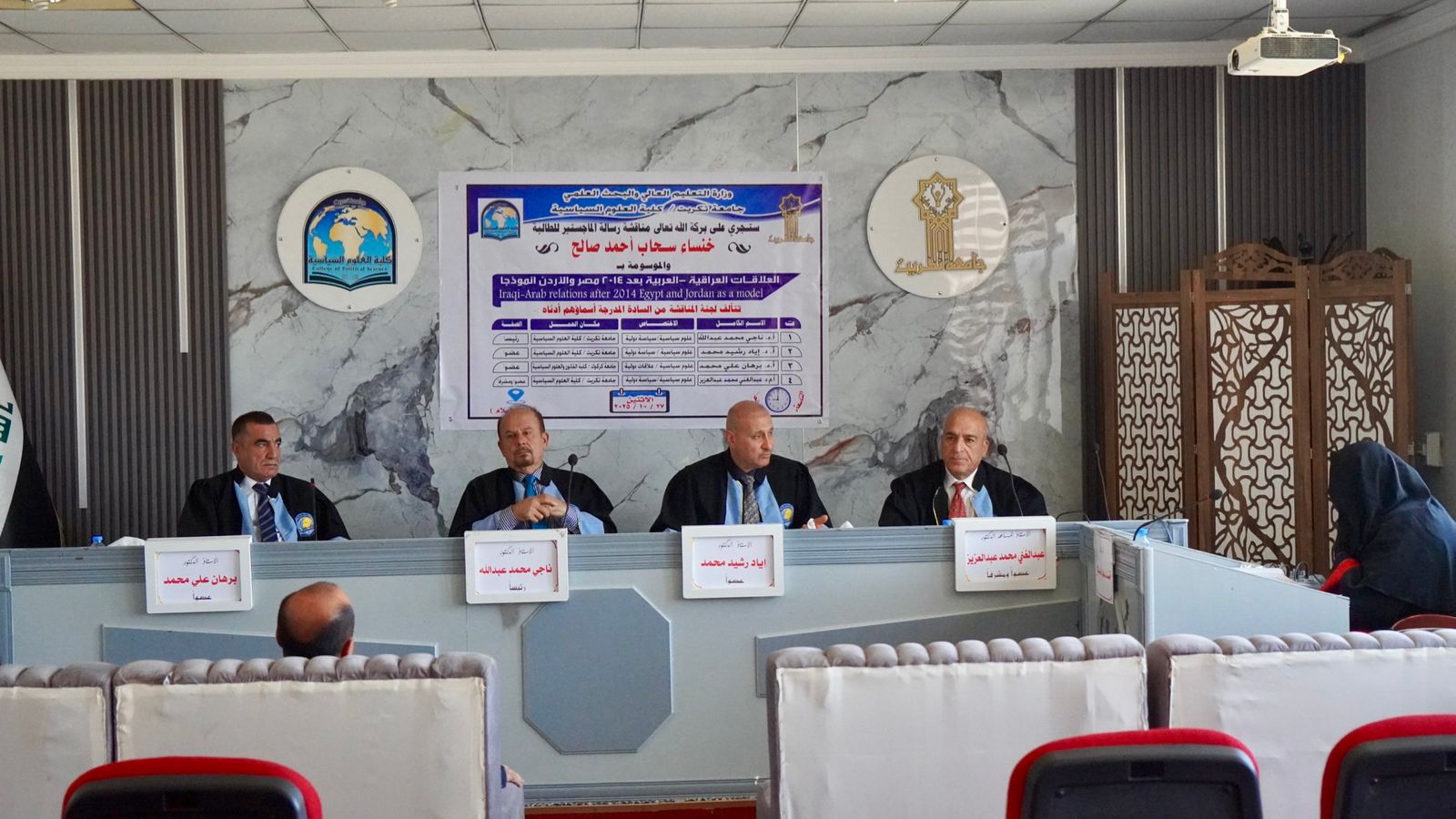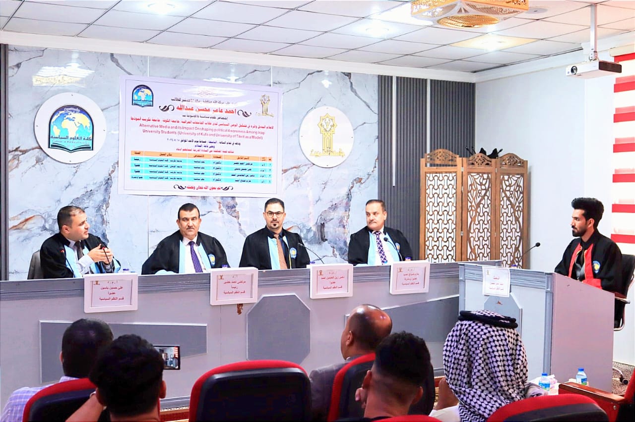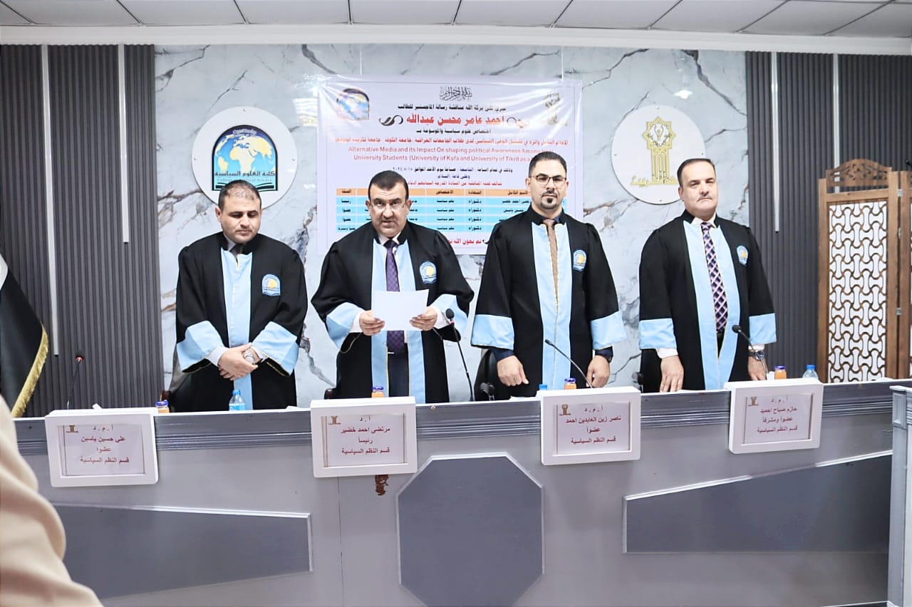 نوقشت في كلية العلوم السياسية رسالة الماجستير الموسومة بـ(العلاقات العراقية - العربية بعد 2014 مصر والاردن انموذجا) للطالبة خنساء سحاب احمد على قاعة السلام اليوم الاثنين الموافق 27/10/2025.
