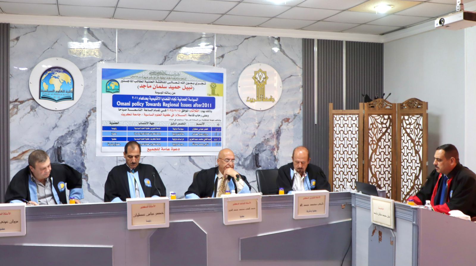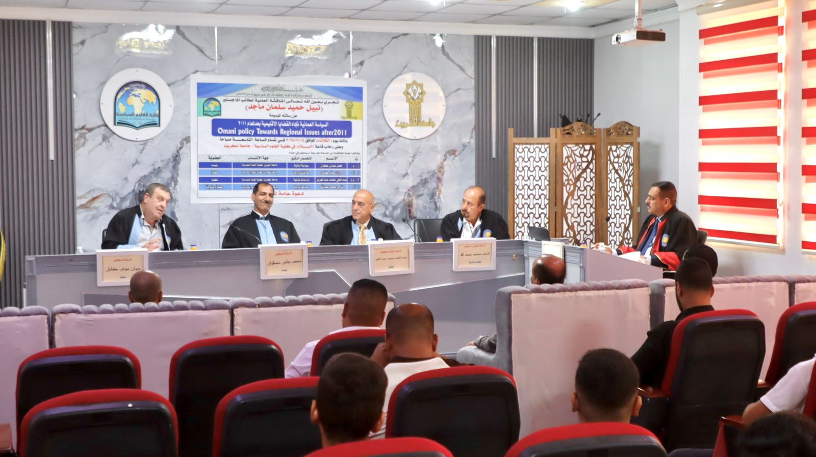 نوقشت في كلية العلوم السياسية رسالة الماجستير الموسومة بـ(السياسة العمانية تجاه القضايا الإقليمية بعد العام 2011) للطالب (نبيل حميد سلمان) على قاعة السلام اليوم الثلاثاء الموافق 15/7/2025.