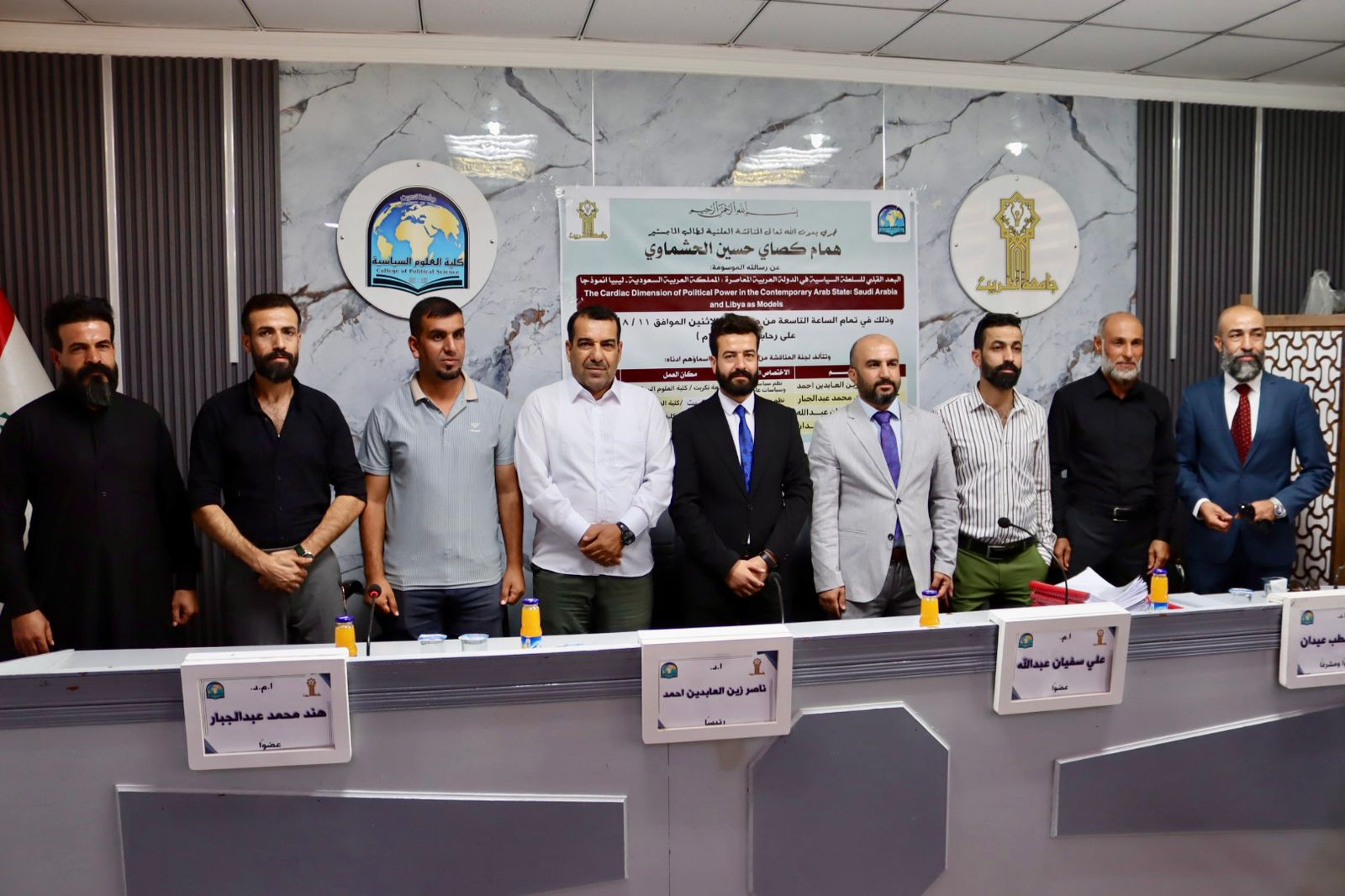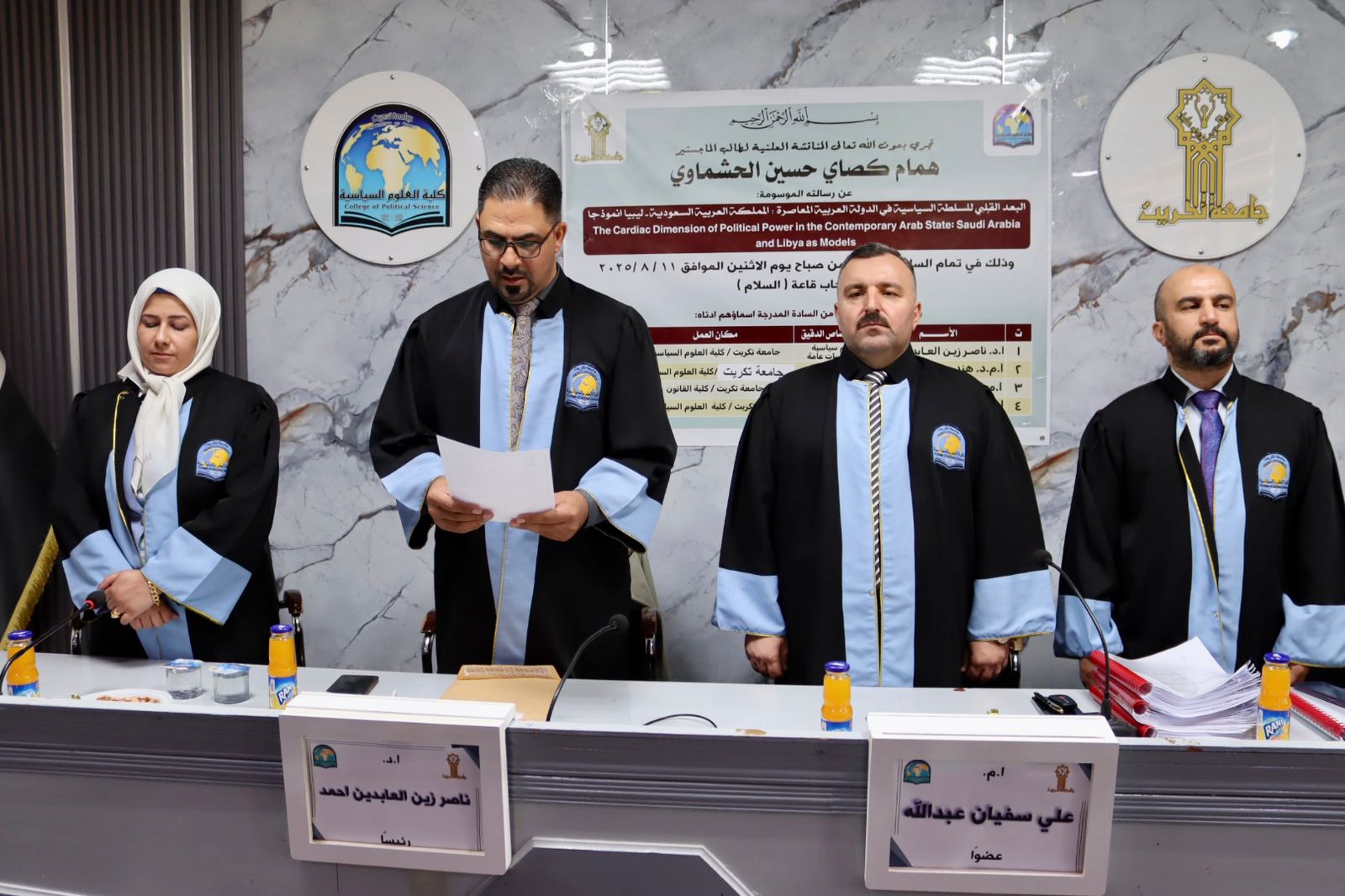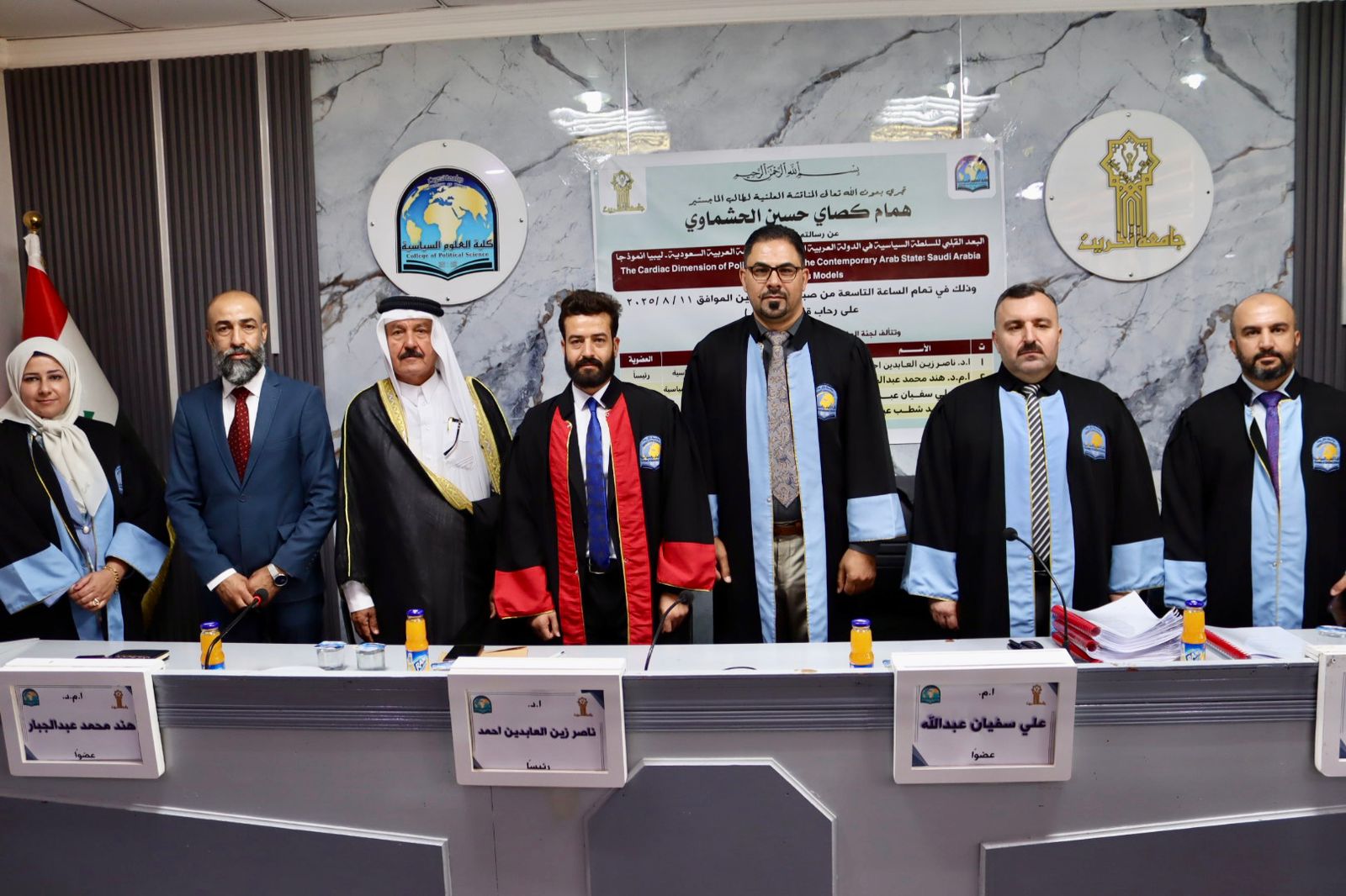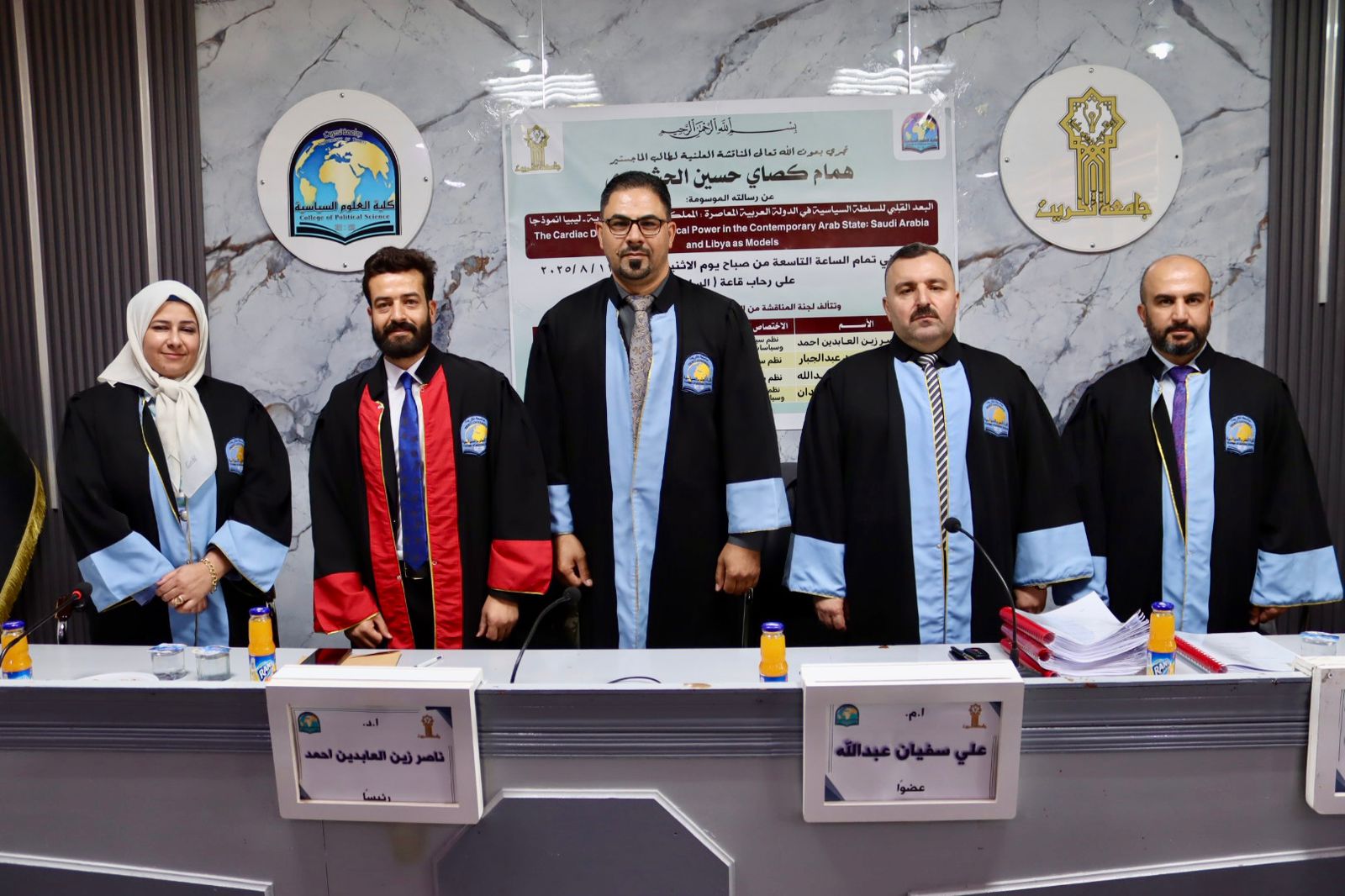 نوقشت في كلية العلوم السياسية رسالة الماجستير الموسومة بـ(البعد القبلي للسلطة السياسية في الدولة العربية المعاصرة المملكة العربية السعودية - ليبيا أنموذجاً) للطالب همام كصاي حسين على قاعة السلام اليوم الاثنين الموافق 11/8/2025.