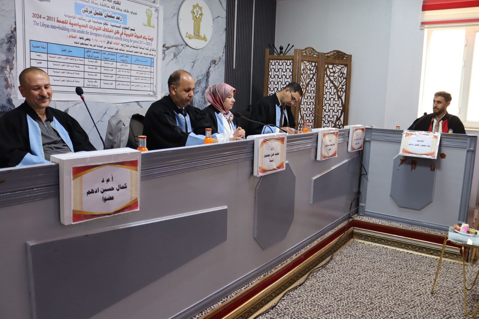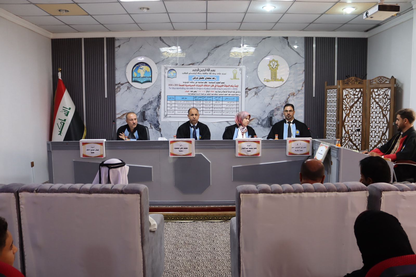 نوقشت في كلية العلوم السياسية رسالة الماجستير الموسومة بـ(أزمة بناء الدولة الليبية في ظل اختلاف التيارات السياسية (2011-2024)) للطالب رعد سفيان خليل على قاعة السلام اليوم الثلاثاء الموافق 19/8/2025.