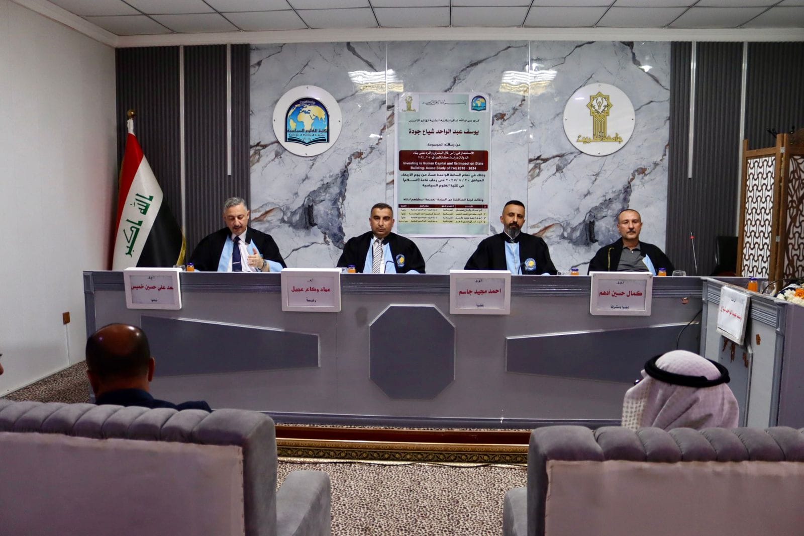 نوقشت في كلية العلوم السياسية رسالة الماجستير الموسومة بـ(الاستثمار في رأس المال البشري وأثره على بناء الدولة: دراسة حالة العراق 2010-2024) للطالب يوسف عبدالواحد شياع على قاعة السلام اليوم الاربعاء الموافق 20/8/2025.