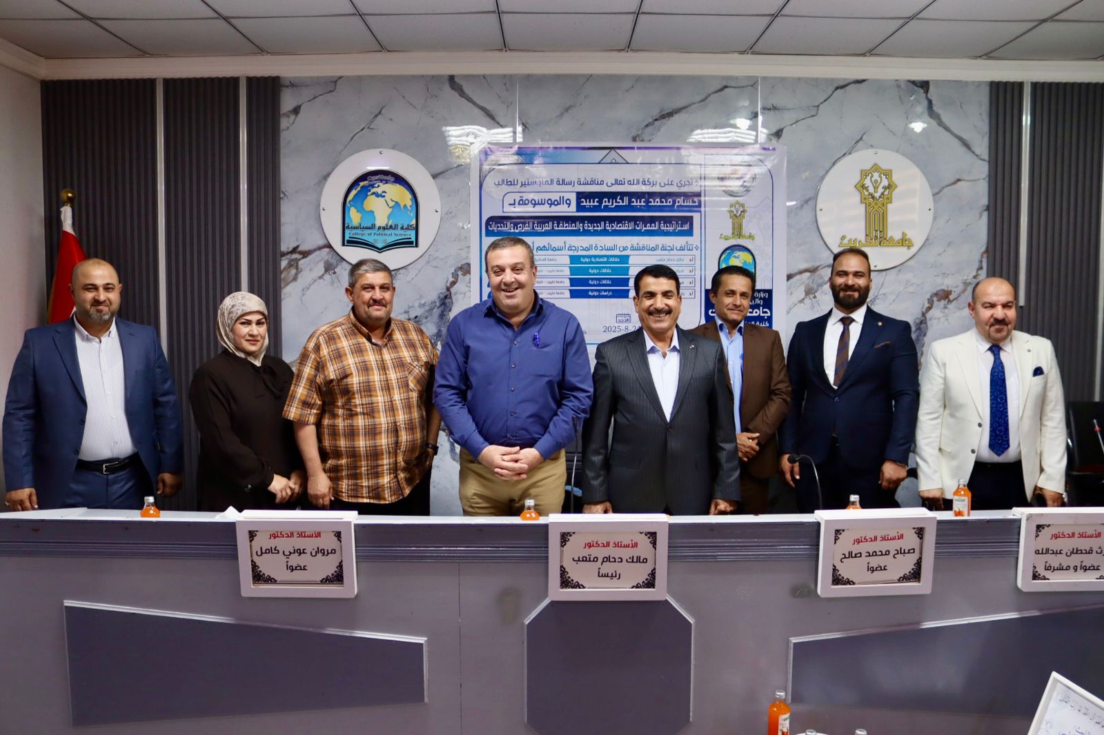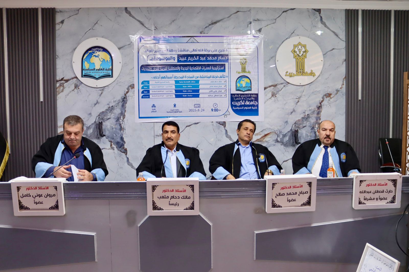 نوقشت في كلية العلوم السياسية رسالة الماجستير الموسومة بـ(استراتيجية الممرات الاقتصادية الجديدة والمنطقة العربية: الفرص والتحديات) للطالب حسام محمد عبد الكريم على قاعة السلام اليوم الاحد الموافق 24/8/2025.