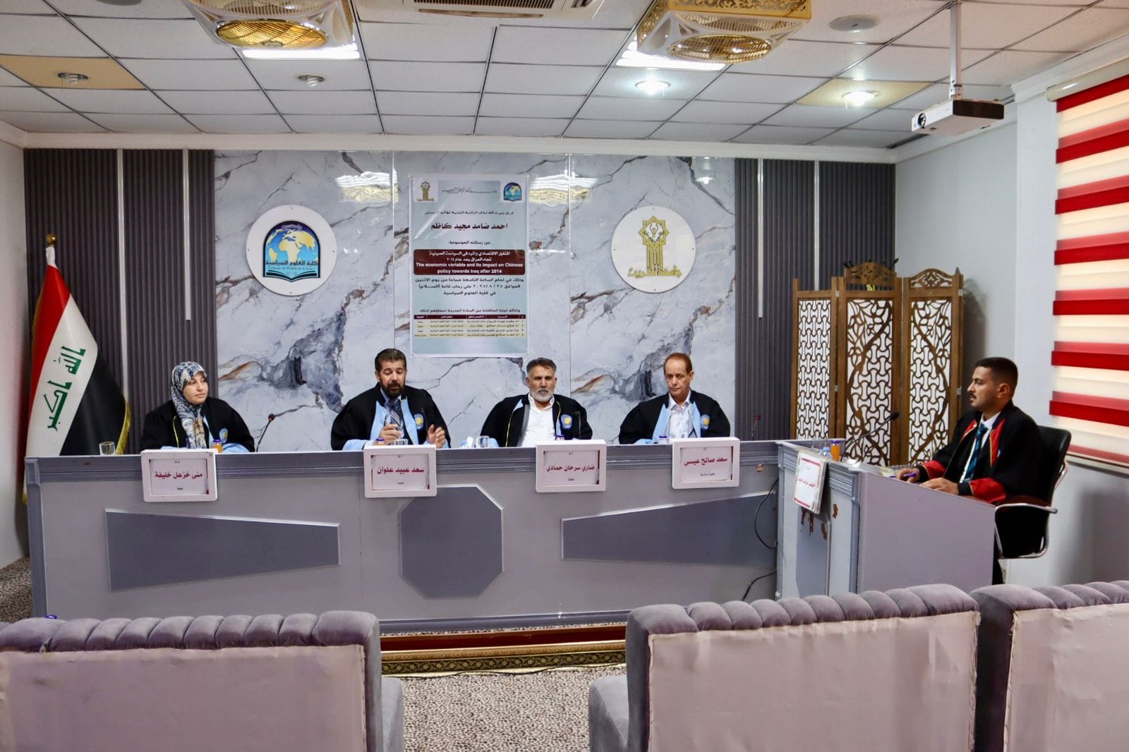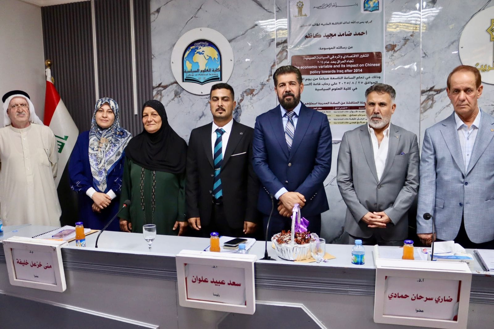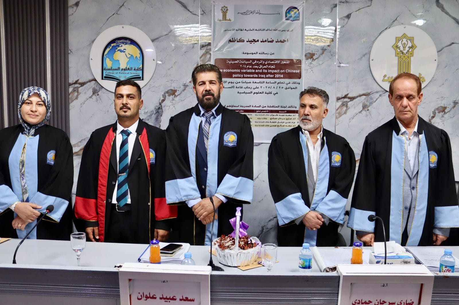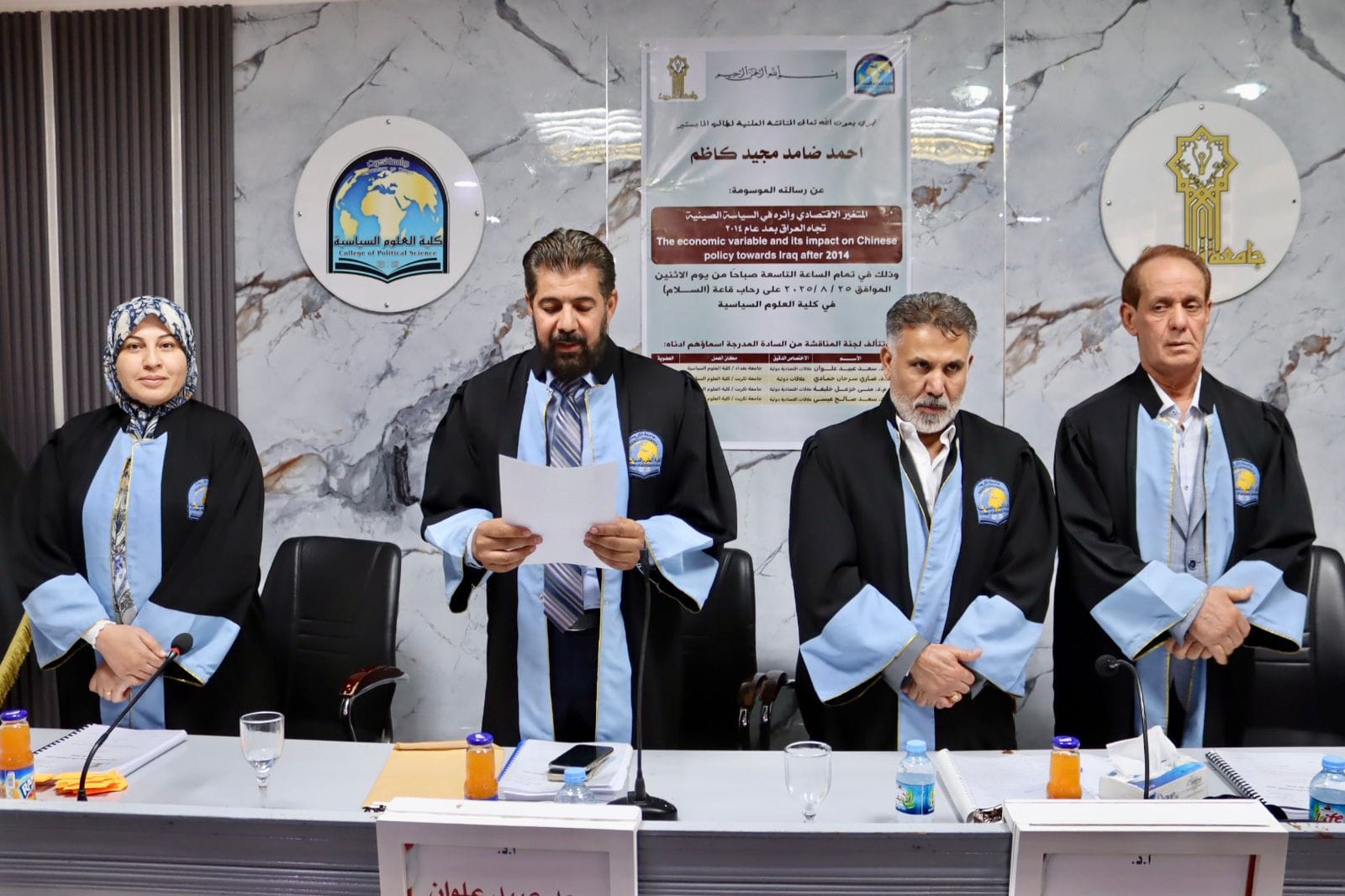 نوقشت في كلية العلوم السياسية رسالة الماجستير الموسومة بـ(المتغير الاقتصادي وأثره في السياسة الصينية تجاه العراق بعد عام 2014 للطالب احمد ضامد مجيد على قاعة السلام اليوم الاثنين الموافق 25/8/2025.