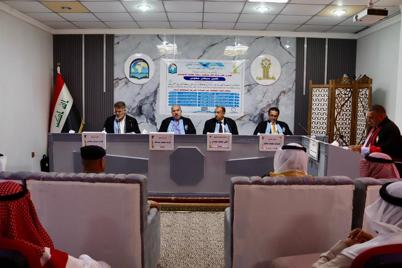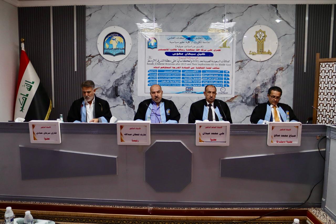 نوقشت في كلية العلوم السياسية رسالة الماجستير الموسومة بـ(العلاقات السعودية الصينية بعد عام 2015 وانعكاساتها على منطقة الشرق الأوسط) للطالب خليل سبهان مهوس على قاعة السلام اليوم الاحد الموافق 3/8/2025.