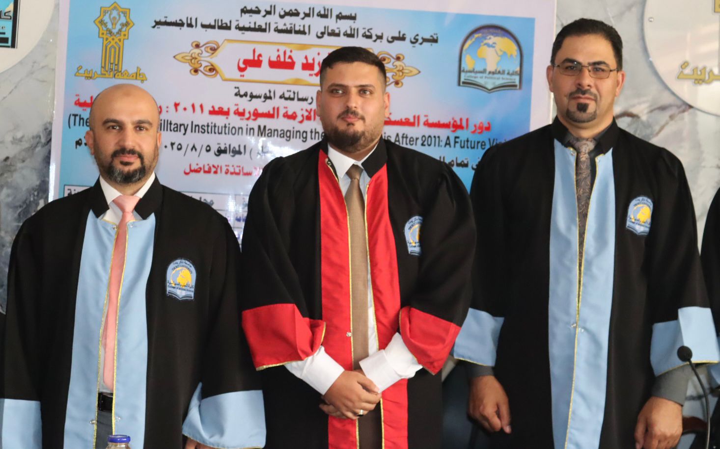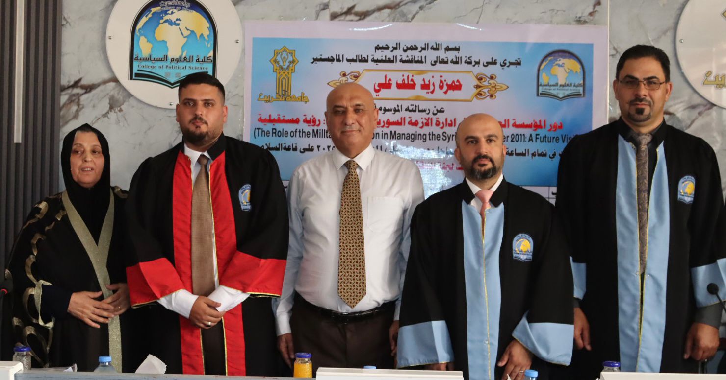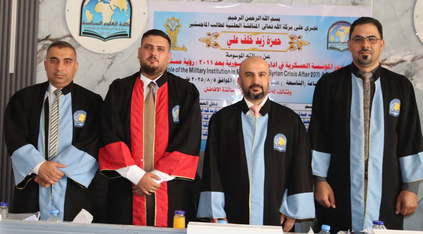 نوقشت في كلية العلوم السياسية رسالة الماجستير الموسومة بـ(دور المؤسسة العسكرية في إدارة الازمة السورية بعد عام 2011: رؤية مستقبلية) للطالب حمزة زيد خلف على قاعة السلام اليوم الاثنين الموافق 5/8/2025.