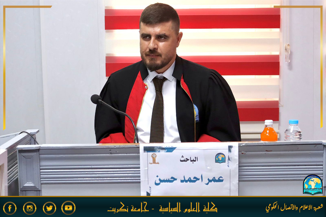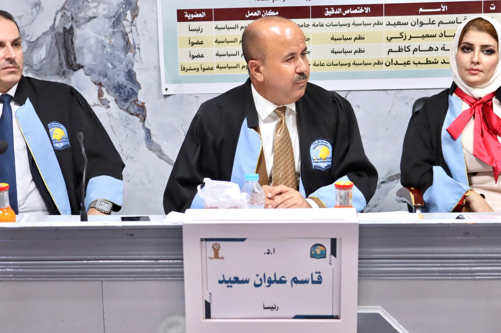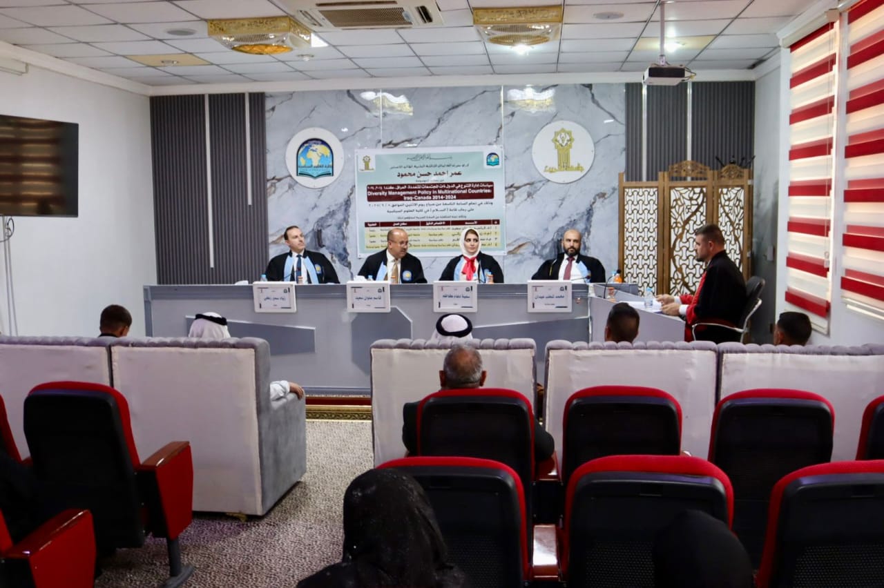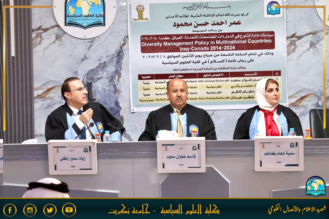 نوقشت في كلية العلوم السياسية رسالة الماجستير الموسومة بـ(سياسات ادارة التنوع في الدول ذات المجتمعات المتعددة : العراق وكندا 2014 - 2024) للطالب عمر احمد حسن على قاعة السلام اليوم الاثنين الموافق 8/9/2025.