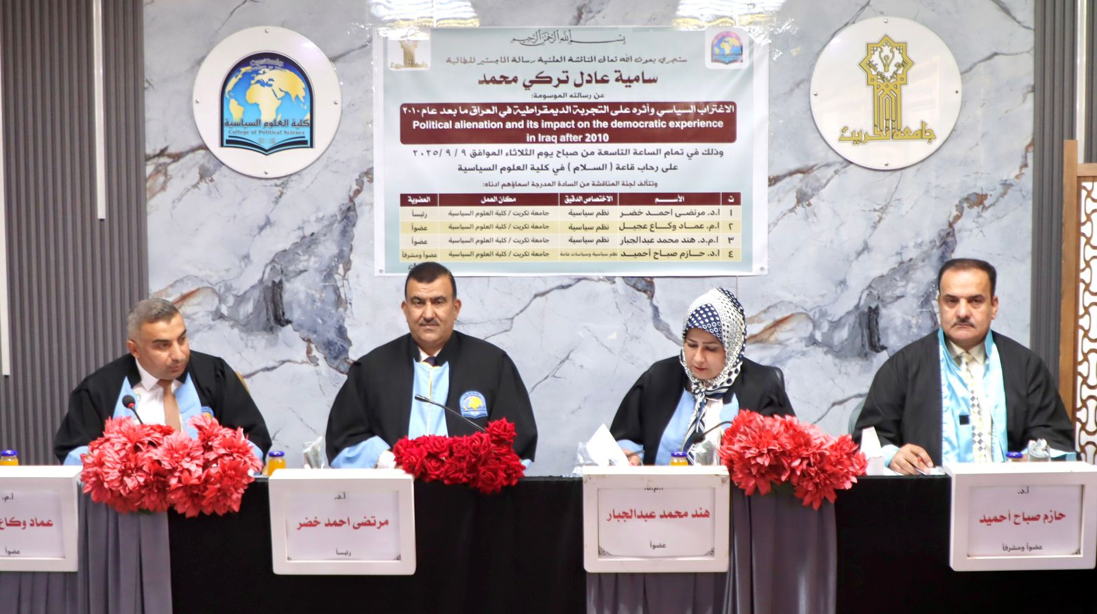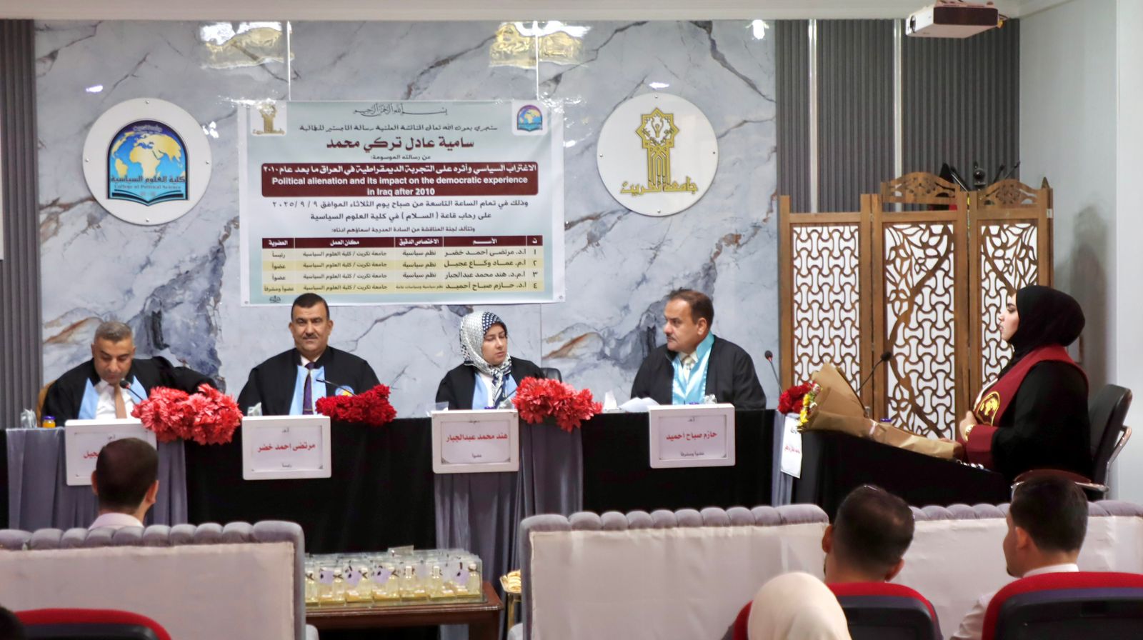 نوقشت في كلية العلوم السياسية رسالة الماجستير الموسومة بـ(الاغتراب السياسي واثره على التجربة الديمقراطية في العراق ما بعد عام 2010) للطالبة سامية عادل تركي على قاعة السلام اليوم الثلاثاء الموافق 9/9/2025.